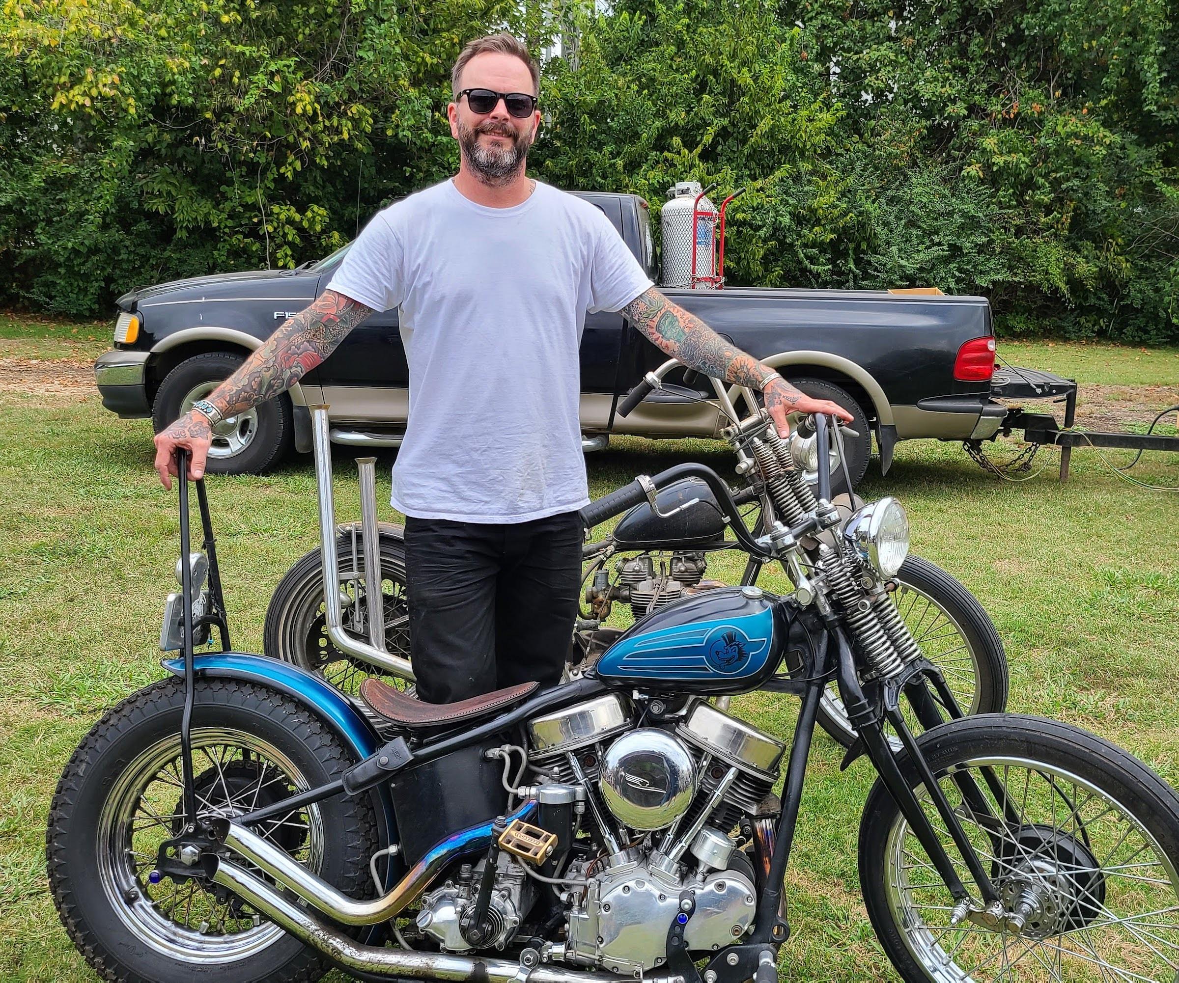 Tyler Burrell (pictured at the top of the story) rode his 1972 Honda Scrambler 175cc to the Rumble. It’s a tiny Japanese motorcycle, pitifully slow by today’s standards. Burrell, a microbiologist for a biotech firm in Fayetteville, bought the bike for $175 and rebuilt the blown engine. Even now, his backpack is loaded with tools and spray lube for frequent roadside repairs.
