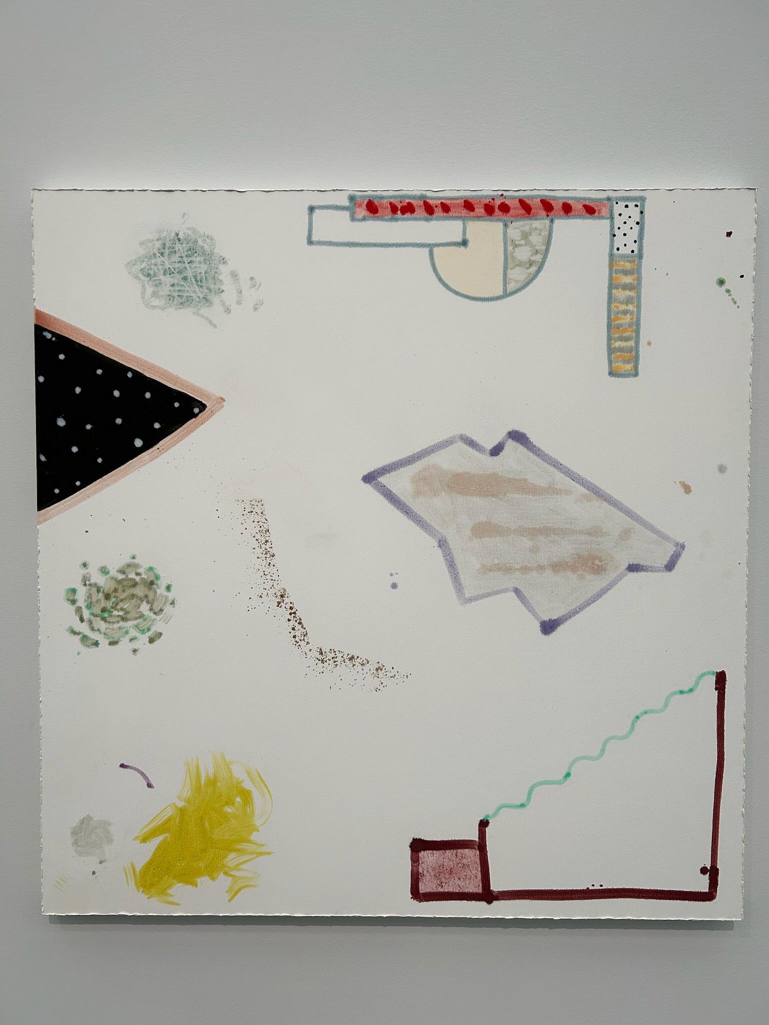 Another untitled work in a similar palette makes an argument between two dimensional and three dimensional space, using ample white space to create depth and tension between the abstract elements that float within it. Of note is a dark triangle that feels like a chunk cut out to reveal the cosmos within, the black of the triangle punctuated with celestial dots. Ultimate depth. The conversation between inorganic and organic imagery moves energy and chaos to order, or perhaps vice versa.