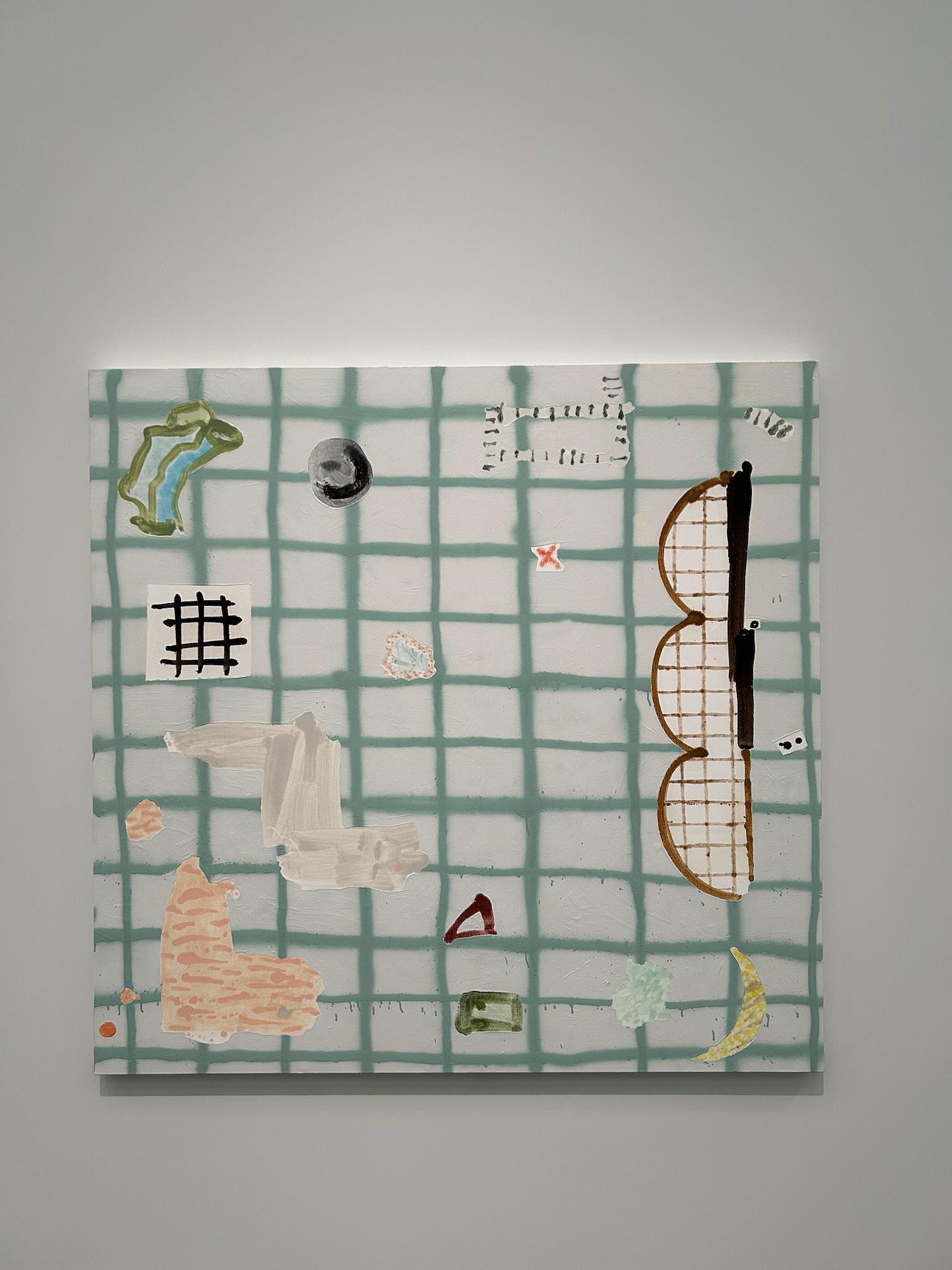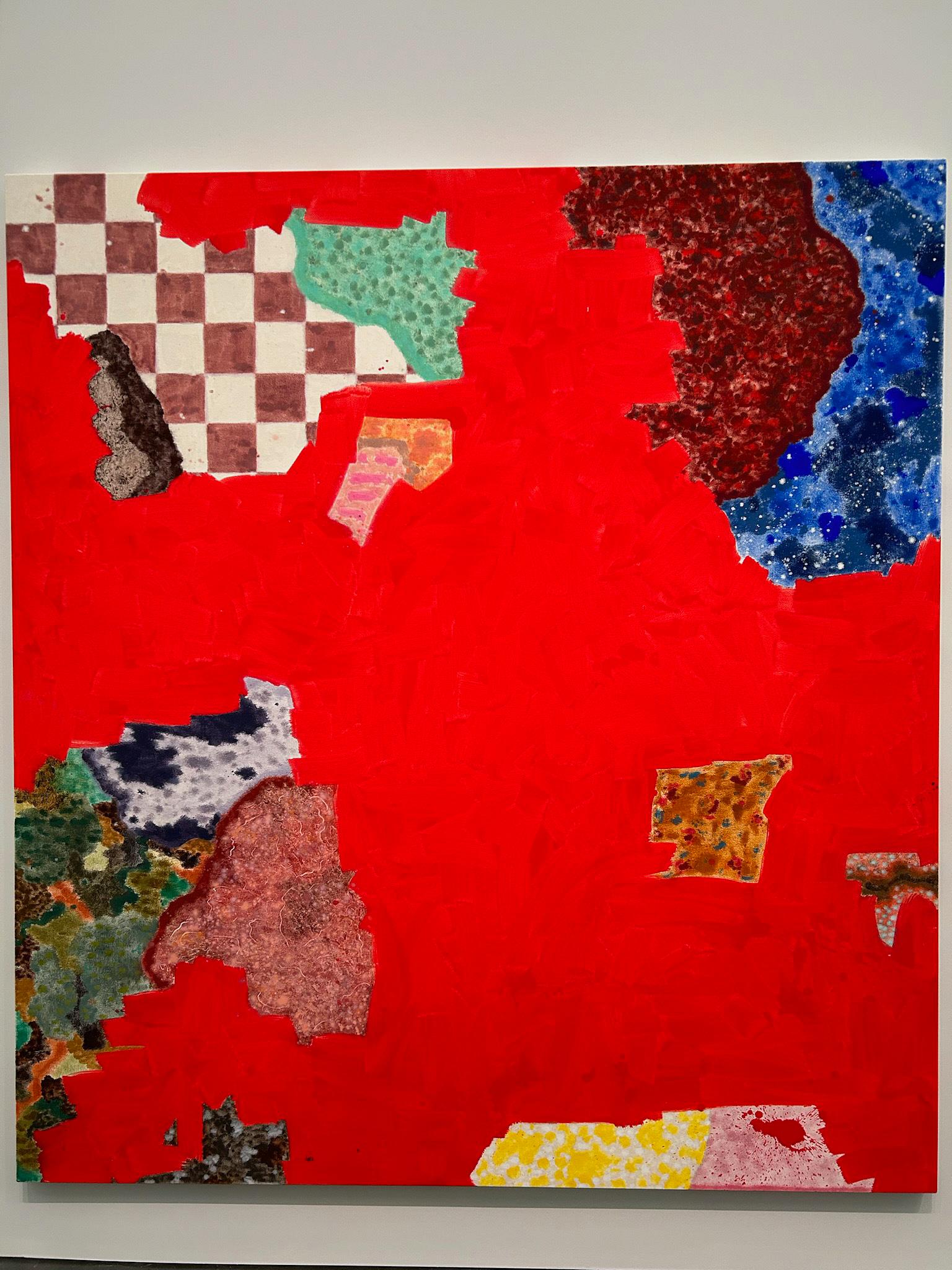 The exhibit quite literally draws you in: We encountered it en route to a different exhibit and, like moths to a flame, found ourselves drawn to the bold shapes and large-scale canvases that stood sentinel near the archway of the exhibit entrance, inviting the passerby to contemplate the organic and inorganic, the linear and the blobby, the bold color palette and the more tranquil pastels. The first visible canvas, Untitled (#03 – 18), is a fiery red, with splotches beneath the surface depicting both inorganic motifs like a checkerboard and more fluid-feeling sections that defy any attempts at definition. Glimpses of more canvases to come beckon as one stares into the gallery, and one cannot help but walk into the parallel universe of a gallery of abstract art.