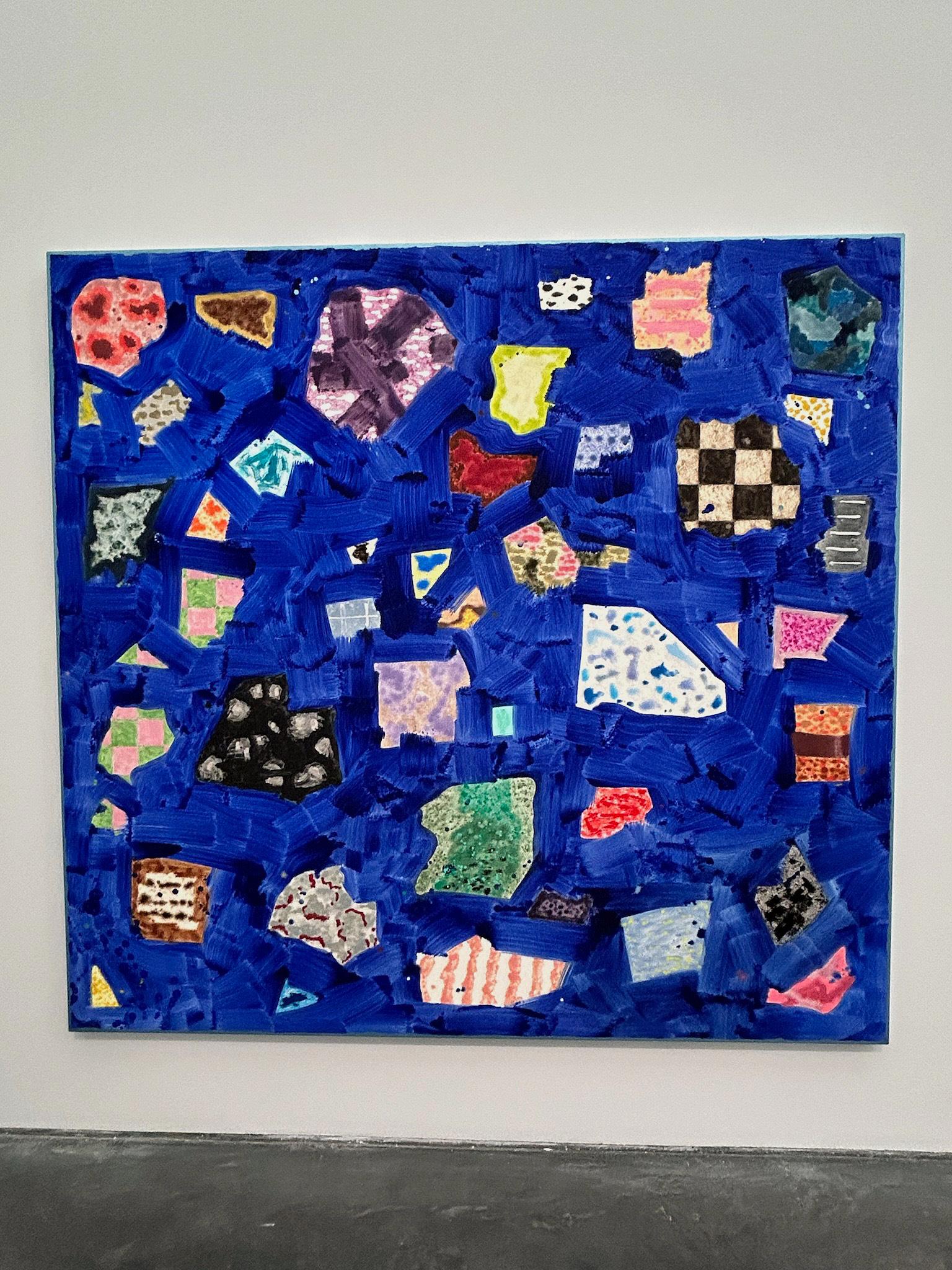 To wander around the gallery of large-scale abstract paintings is to activate a different part of the brain than navigating the rest of the museum. There is nothing allegorical or symbolic here. One must engage on a deeper level with the play of line, shape, and color to derive a sense of what each piece of art elicits. Fellow travelers in the gallery stood at length in front of Morris’s paintings, slowly and mindfully peeling back the portions of the human brain evolved to recognize patterns and make meaning. The sizes of the canvases begged careful inspection; many leaned close (but not too close) to examine a detail, as if a small splotch or crosshatch could make the whole thing legible. The expansive first floor gallery at the Museum of Contemporary Art, with its high ceiling and airy light diffusion, felt an apt home for such powerful works of saturated color.