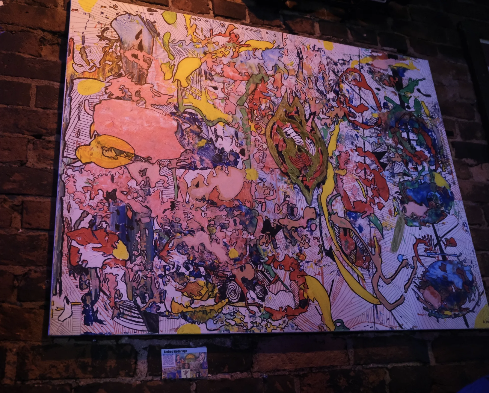 For Madariaga, a tattoo artist and cat rescue worker currently living in Fair Haven, the night was personal. Madariaga immigrated to the U.S. from Colombia as a teenager. His work grapples with the complexities of belonging and the push-pull of navigating dual identities. His second piece on display, Not from here or there, incorporated Goya spice labels and McDonald’s iconography. “That one is an older piece, done in a different style,” he said, “but it still has to do with being in two places at the same time.”