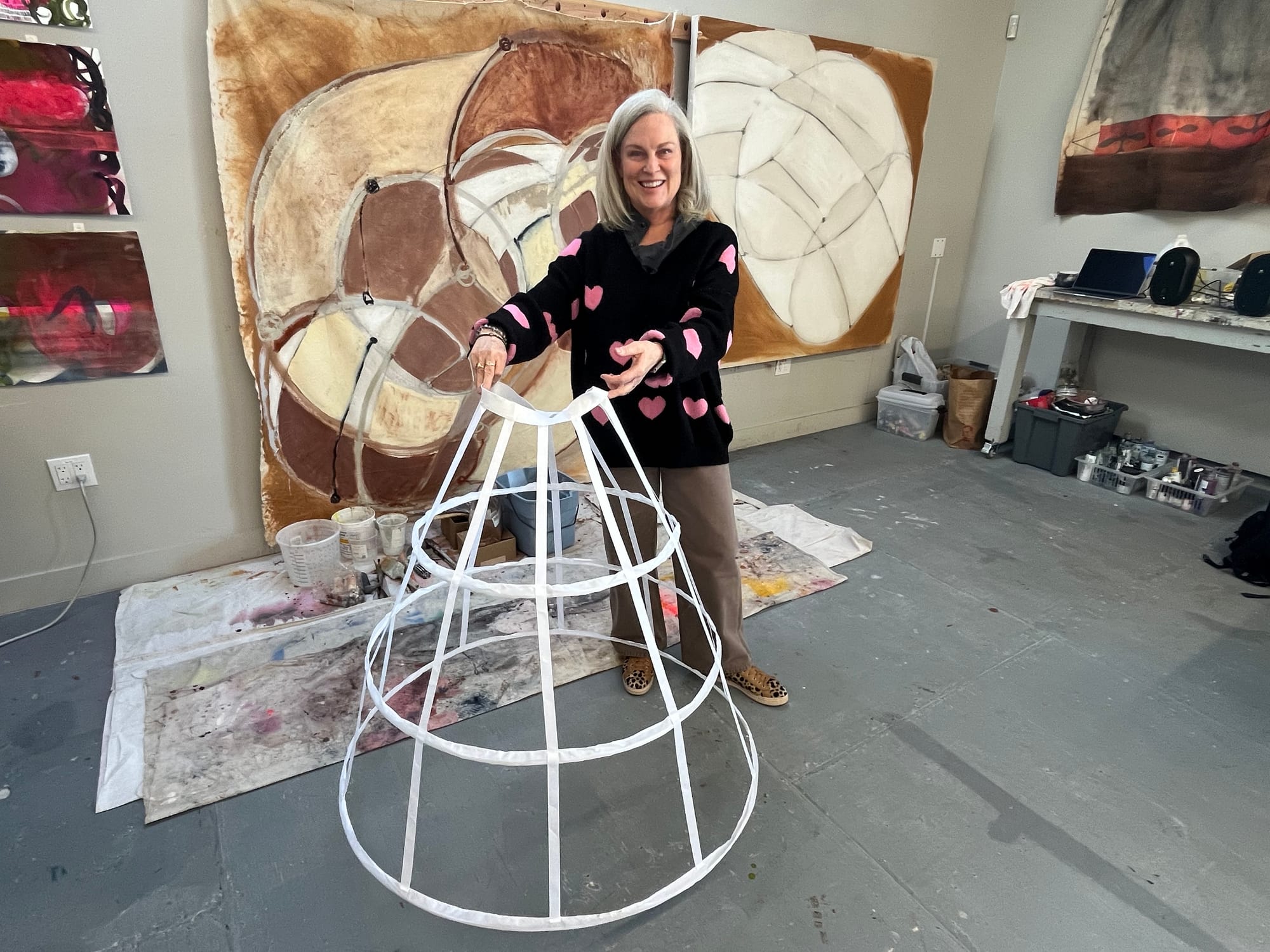 Although I abandoned postmodernism and its rejection of objective truth long ago, it was interesting to hear Korotzer talk about her newest themes in terms of postmodernist theory. “We’re all more than human, we’re ‘cyborgs’,” she said, influenced by the feminist theory of Donna Haraway.“I use the staining red clay as a way to have a physical reference to the place I was born—a way to remember and recognize all the customs and conventions that formed my identity as a child and young woman there, and how I have learned to deconstruct the ones that haven’t been affirmative.” She told me that she is “always thinking about the duality we face in life, how to ease the borders between us and how to deconstruct restrictive systems. That’s where the metaphor of the crinoline comes in,” the visual deconstruction exploring gender roles, both historically and in the future.