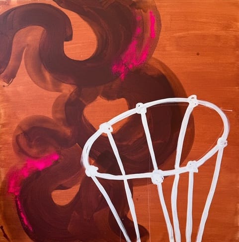 Along with acrylic, ink, fluorescent pigment powders, glitter, graphite, gouache, charcoal, and a variety of mixed media, Korotzer has now added red clay to the repertoire of materials she uses in her newest paintings. The clay, she told me, is shipped from Georgia and comes “from some guy’s front yard in a town within an hour of where I was born.” A native of Elberton, a small town in northeast Georgia, Korotzer uses the clay in work that explores themes of posthumanism. Using the clay as a base over raw canvas, Korotzer superimposes stylized images of crinolines on these backgrounds, stiff petticoat armatures that are used to hold out voluminous skirts, common women’s garments in the mid-19th century.