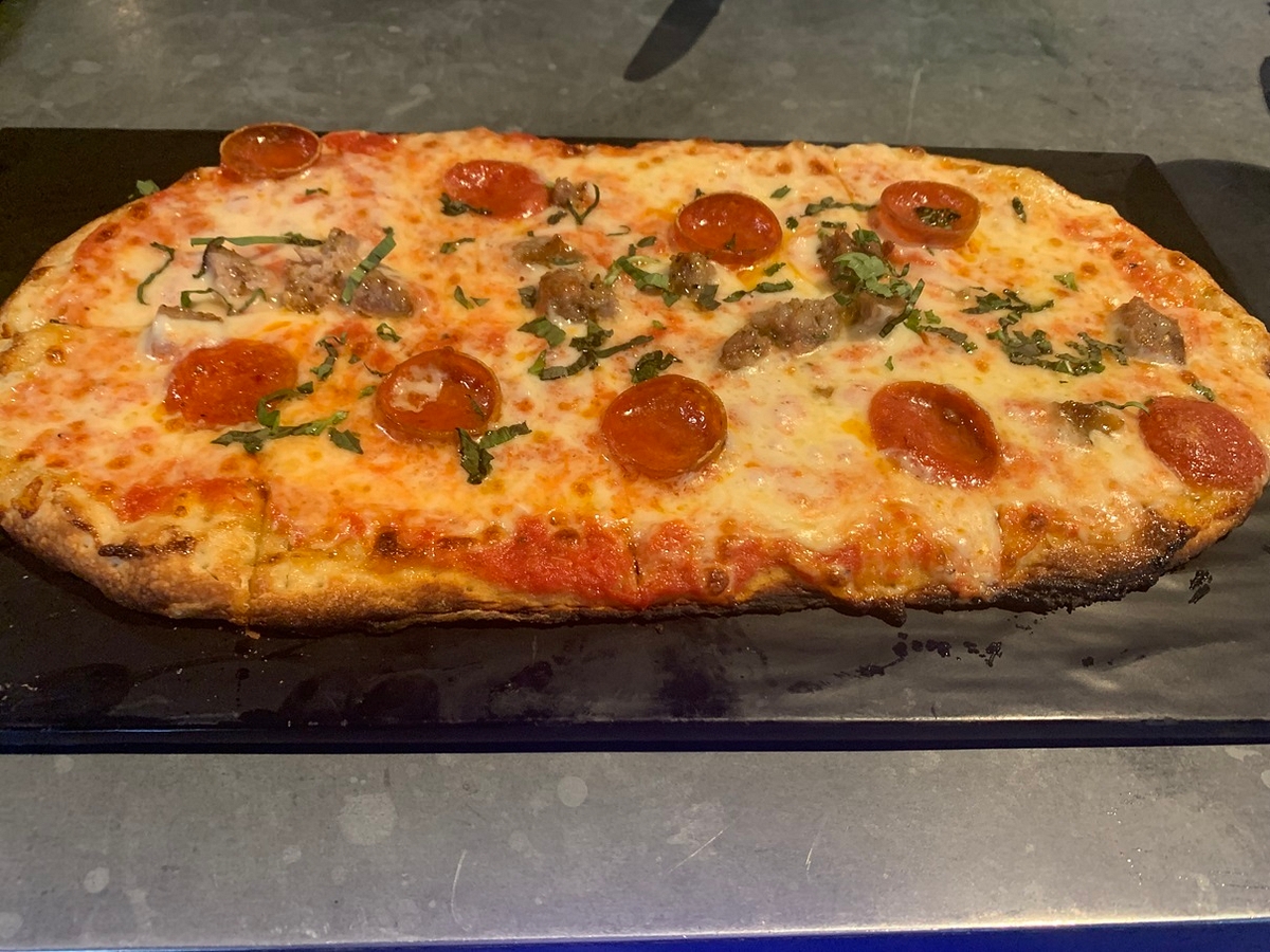 I also ordered was the sausage and pepperoni pizza. Covered in sweet Italian sausage, Rosa Grande pepperoni and basil, it offered a nice contrast to the lightness of the shrimp scampi pizza, with a heavier red sauce complimenting the spiciness of the sausage and pepperoni. The cheese wasn’t quite as flavorful as the provolone on the shrimp scampi, but it gave the meats more room to breathe and dominate the flavor profile.