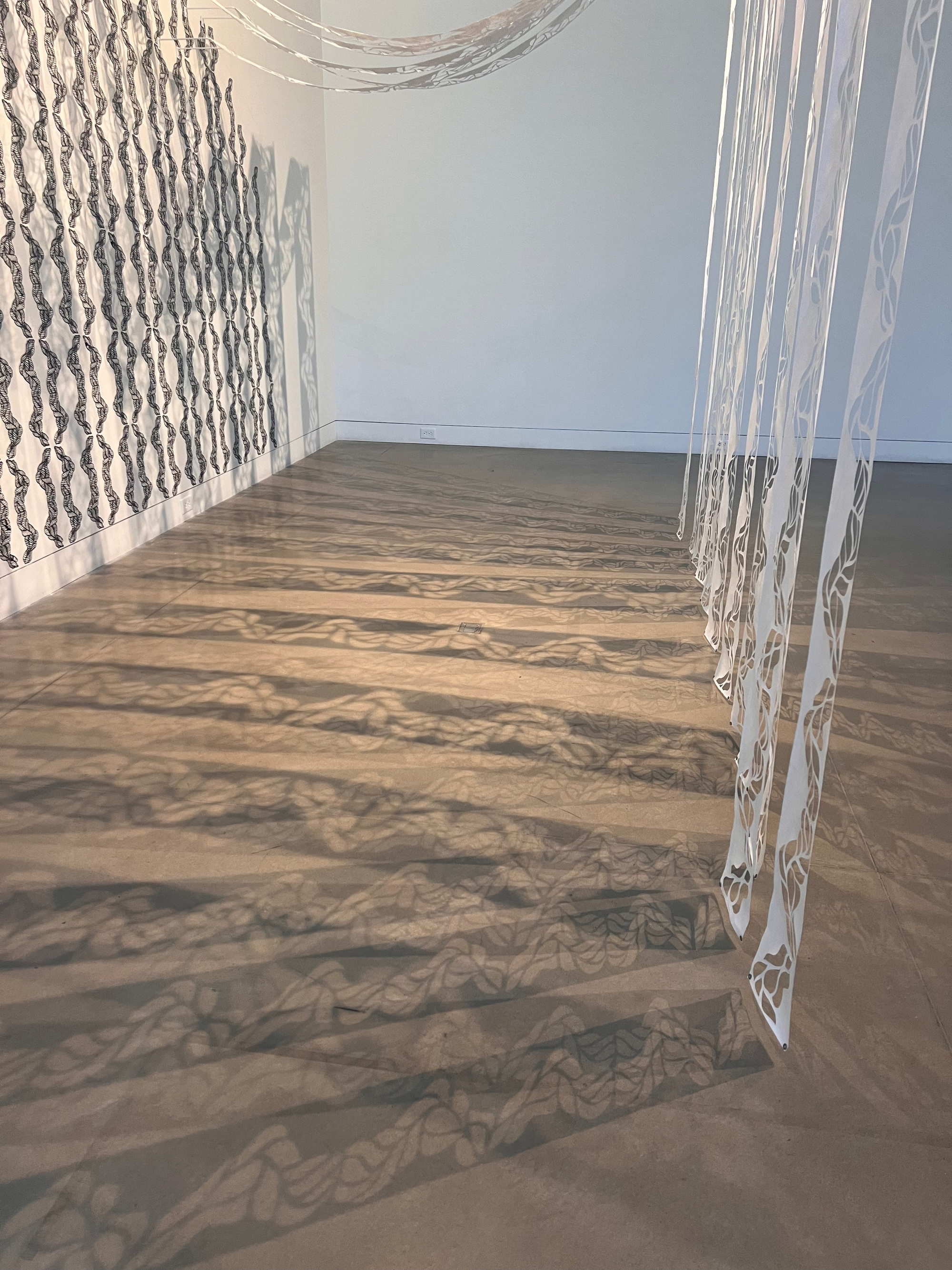 As I walked through the gallery, the installation’s white strands shifted quietly behind me, moving the patterned shadows on the floor. Martin closed the window shades to show how the exhibit shifts without sun. The track lights blew a gale of light through Kelly’s cuts, darkening the shadows and giving them a polished shape. We walked through the show anew, peeking again into the negative spaces created in Kelly’s knife marks, the shadows on the wall coming into focus.