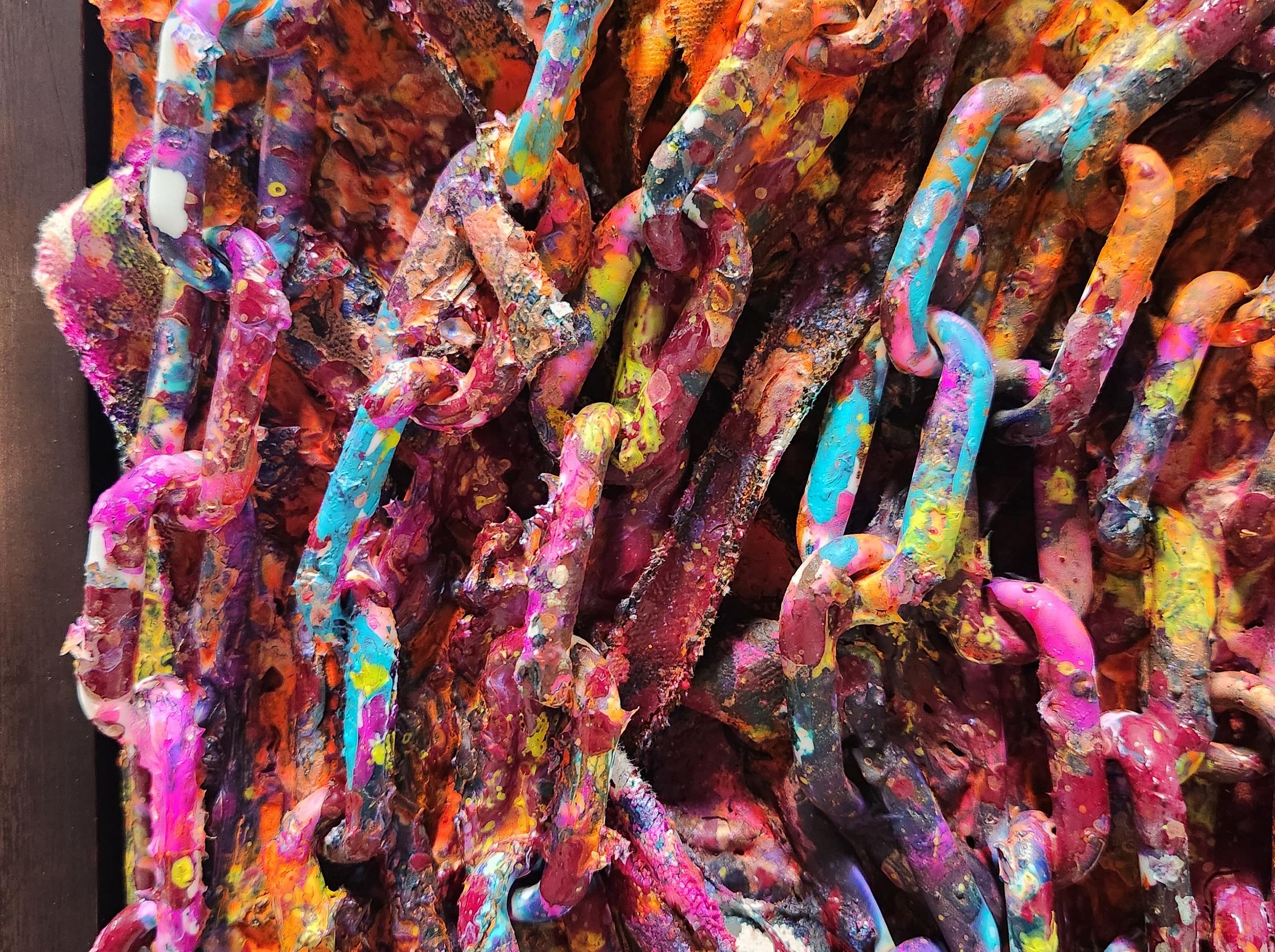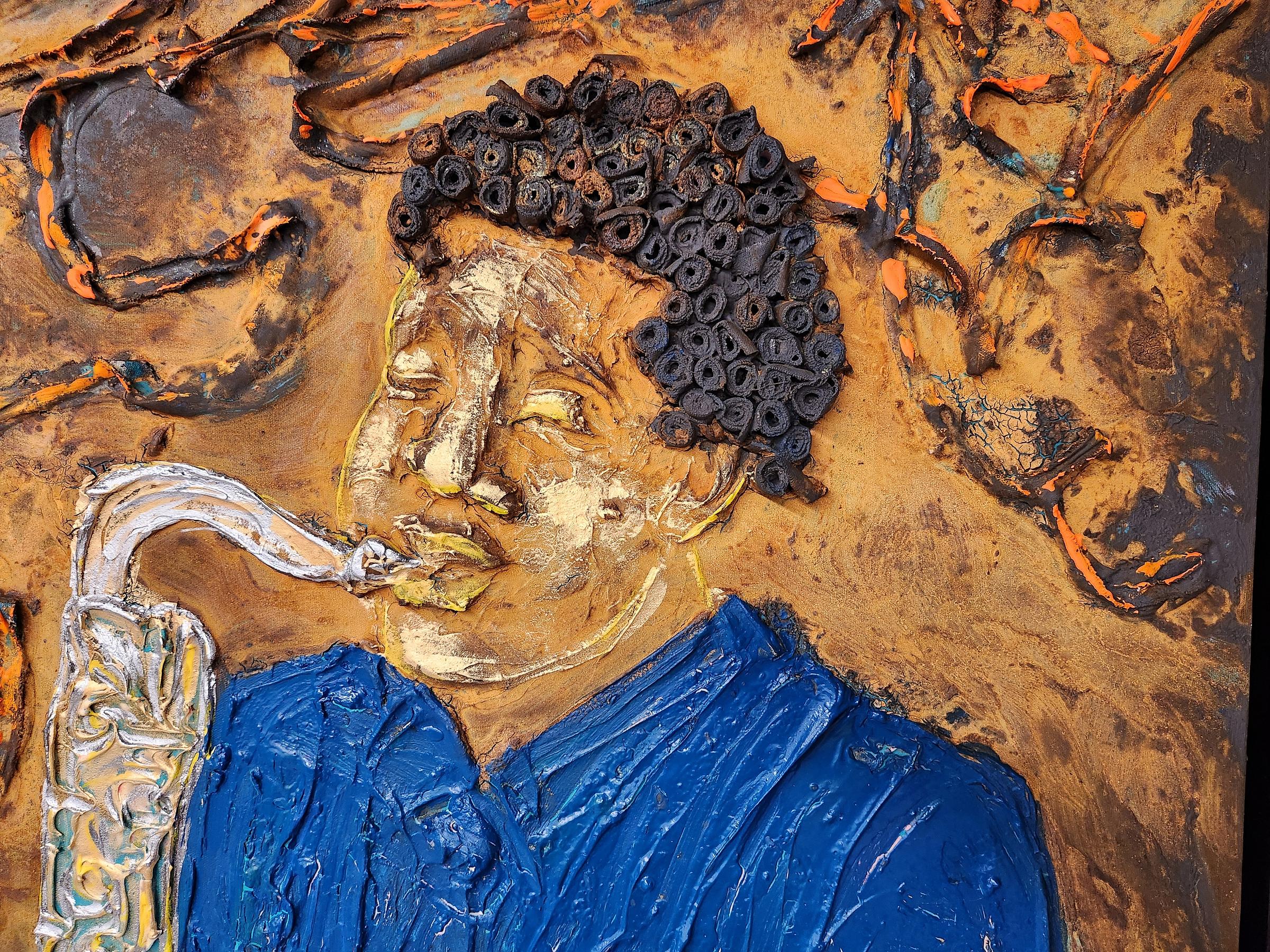 Andre’s works included rolled canvas hair, such as in “Improvisation (sax) IV,” and thickly coated chain links coiled into concentric circles in “Creation” and metallic instruments in others like “Improvisation (Trio) III,” or alternative hair patterns (“Sisters II). Part folk art and all feeling, these people hold each other, themselves, and their instruments, with love.