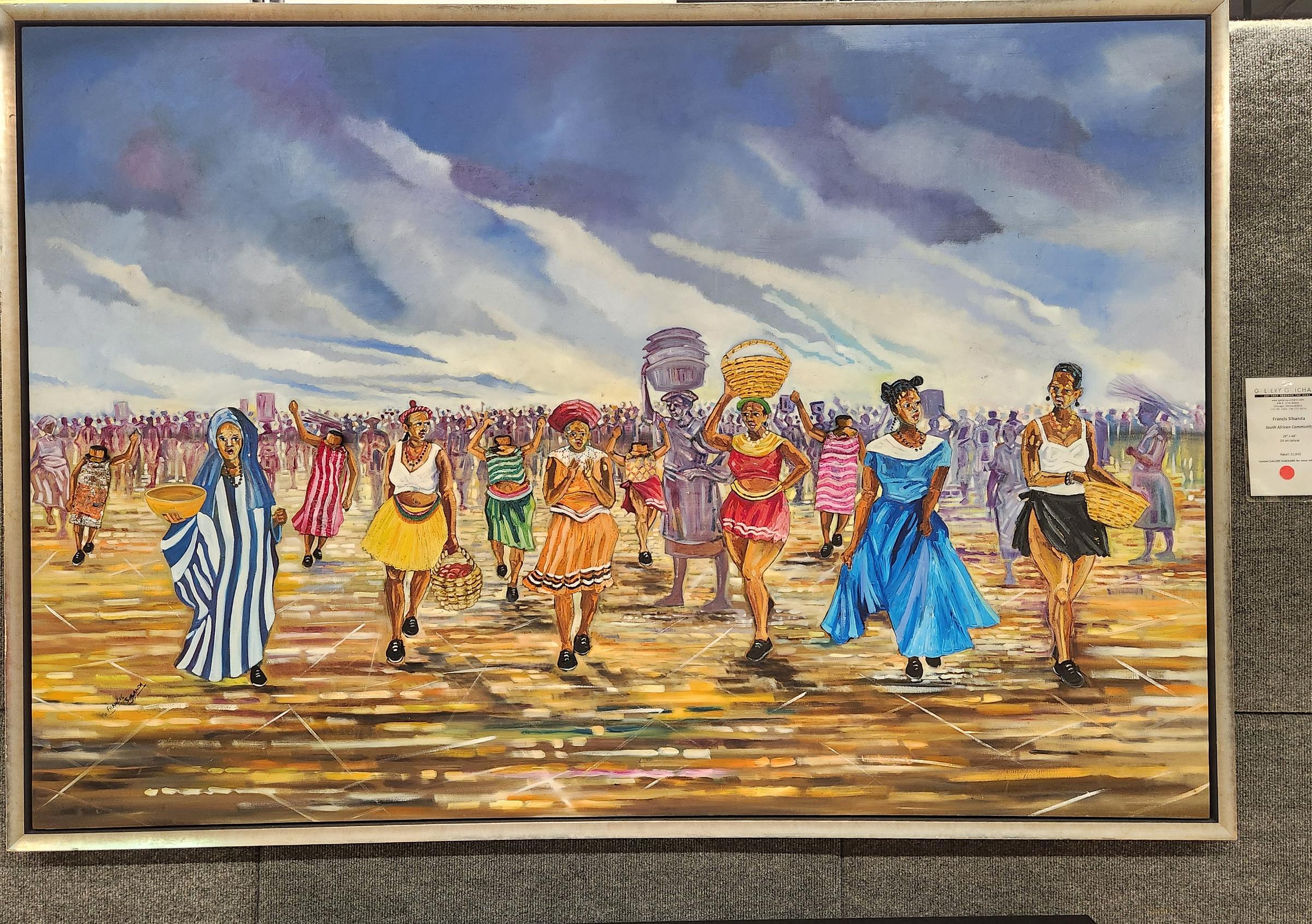 The final piece I lingered on was Francis Sibanda’s “South African Community,” a joyous scene of a large crowd of obscured figures led by a dozen in-focus and colorful women, the ground ahead of them sparkling in oil paint. Arms are raised, wardrobes are colorful and striped, baskets are carried. Five of them are paint tubes. Even headless, their bodies emanate intention, their dancing limbs caught in motion. The tube bodies are a wonderful Easter egg, barely altered but somehow profoundly human, a delight to peer closely at.