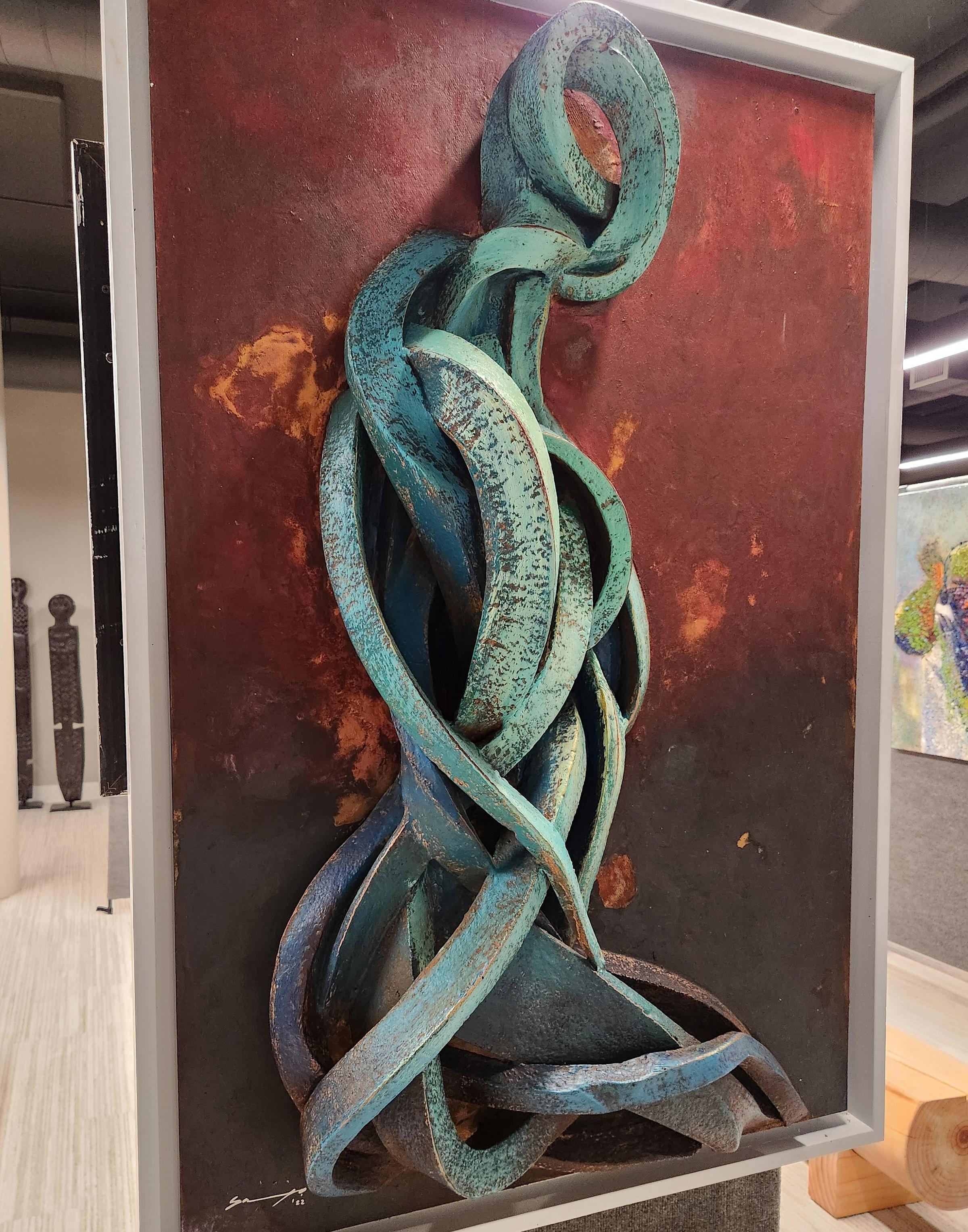 Some rusty canvases, such as “Expectation” boasted 3‑D figures, twisted and patina’d, open but sturdy, their heads a swoop of smooth lines and limbs intertwined with their inside while also bulging outward. Others, like “Tender Gaze,” were acrylic paintings of lovingly rendered faces gently distorted with smudged linear lines, a film grain, charcoal, or crayon drawing dragged downward, eyes left undisturbed.