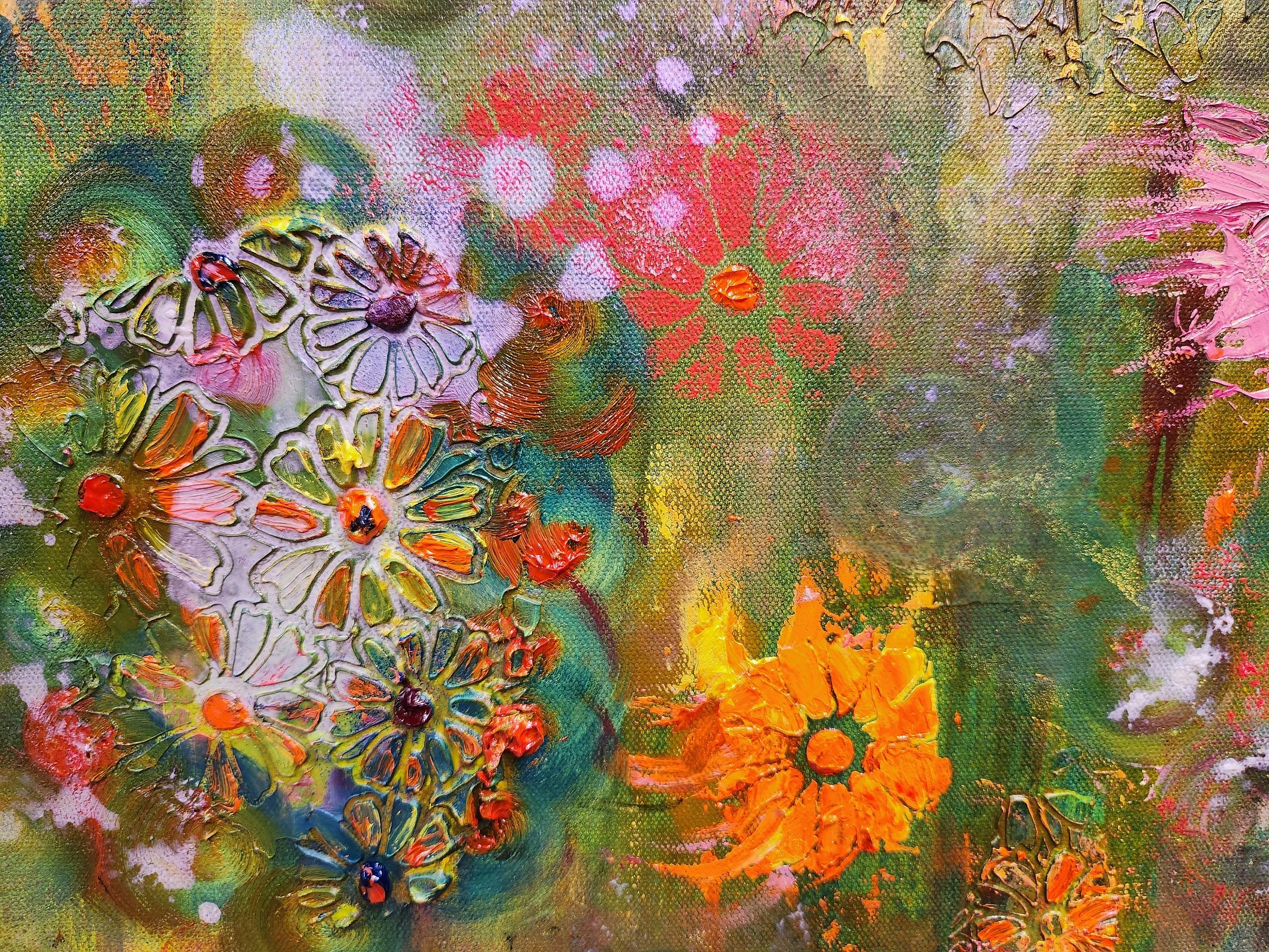 In a temporary gallery space, canvases came to life. On gray felt walls hung one-to-five foot pieces bursting outward, upward, toward the viewer. They begged to be touched, to be held, perhaps. Figurative in some spaces and wildly abstract elsewhere, the pieces breathed in the could-be-sterile space.
