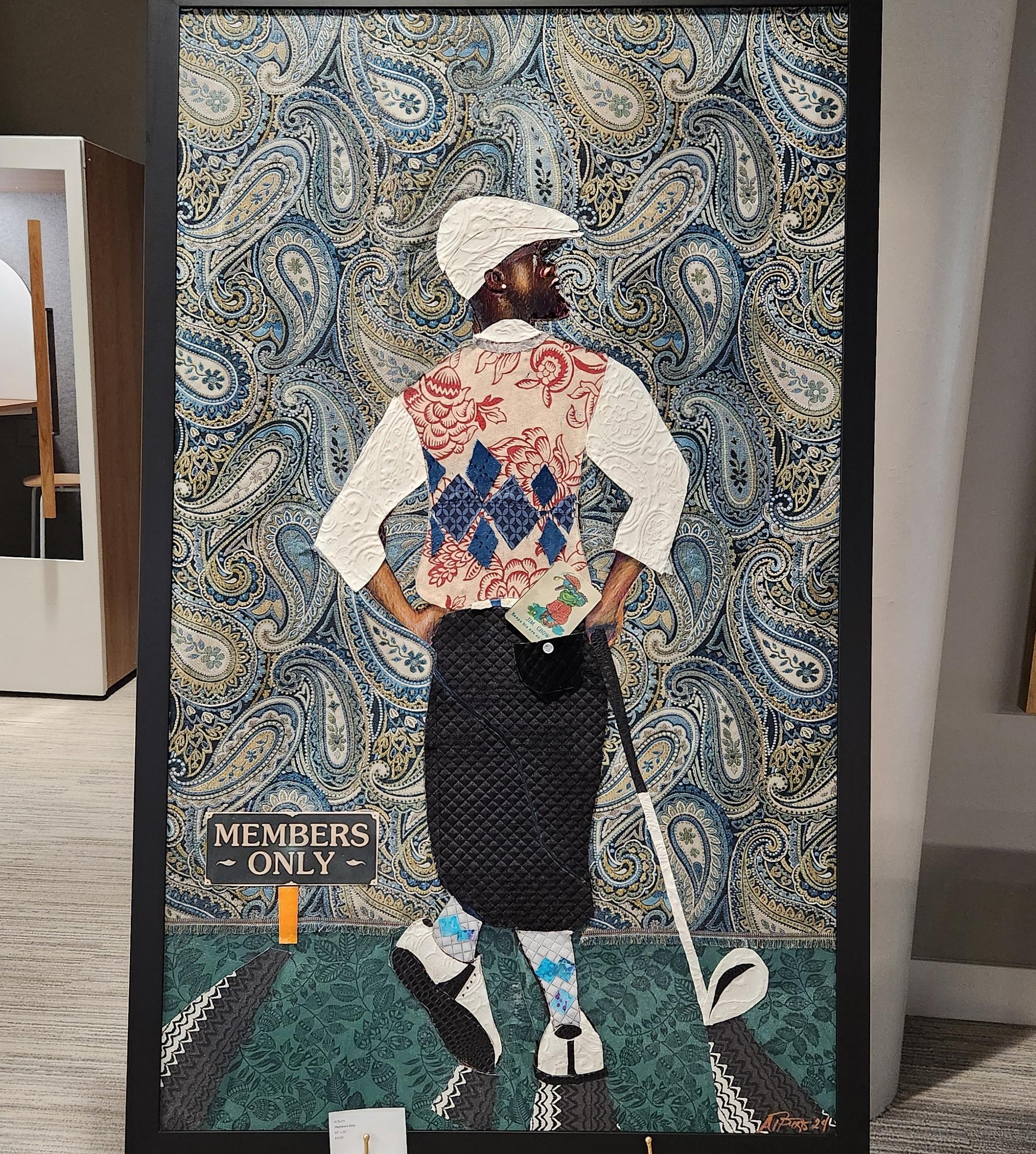 Al Burts’ “Members Only” and “Rose” and “Adamah” differ wildly in every way except for the unnerved but awed feelings they impart. His works vary greatly in media and method, but all display a profound mastery of his crafts. “Members Only” is all layers and texture; the figure’s back to the viewer, defiant and proud in stature and profile. The mixed media (jacquard fabrics, quilting, embossed paper? wallpaper?) provide intricate detail to the simply cut lines of the figure and backdrop. The lettering, a “Members Only” sign by his ankles in the bottom left, and a small booklet tucked into the golfer’s back pocket reading “Jim Crow Keeps his eye on [illegible],” speak more loudly than the intense patterns collaged around them.