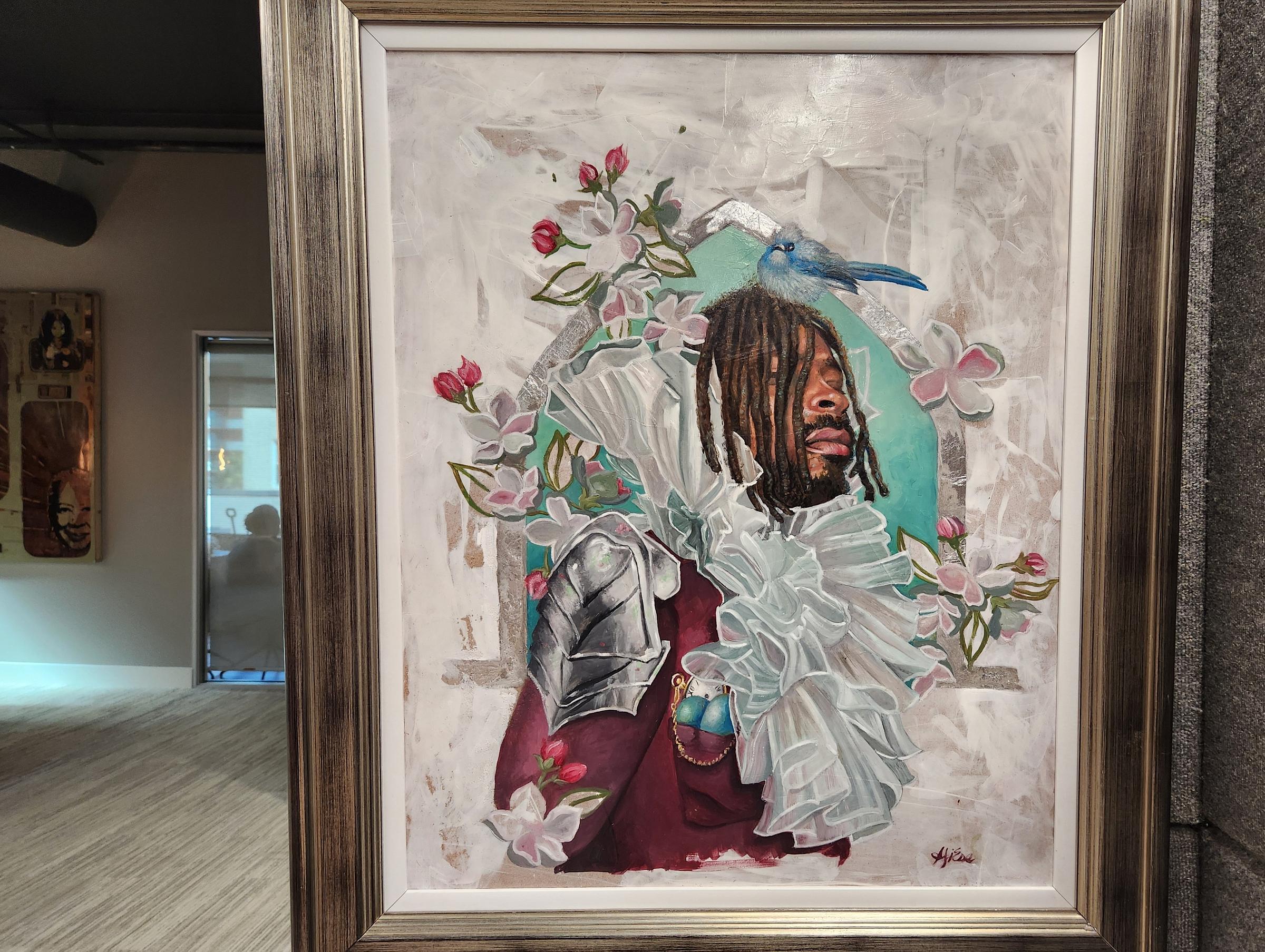 Afi Ese‘s “Sir Chesare,” painted in oils, silver gilding, and plaster on Masonite, is a luminous portrait, the rich hues of the subject’s maroon garb and skin, hair, lips, a testament to the importance of representation. The accompanying artist statement reads: “Moorish people from across North Africa have been depicted in European art since Medieval times, often as servants, hidden within dark areas of the painting, or with exaggerated features meant to look unflattering. Black people are worthy of being the focus.” His gold pocket watch and armored shoulders strong and regal, his expression soft, head crowned with a small bird and surrounded by roses, soft pink-and-white blooms, and a glorious ruffle of sheer fabric.