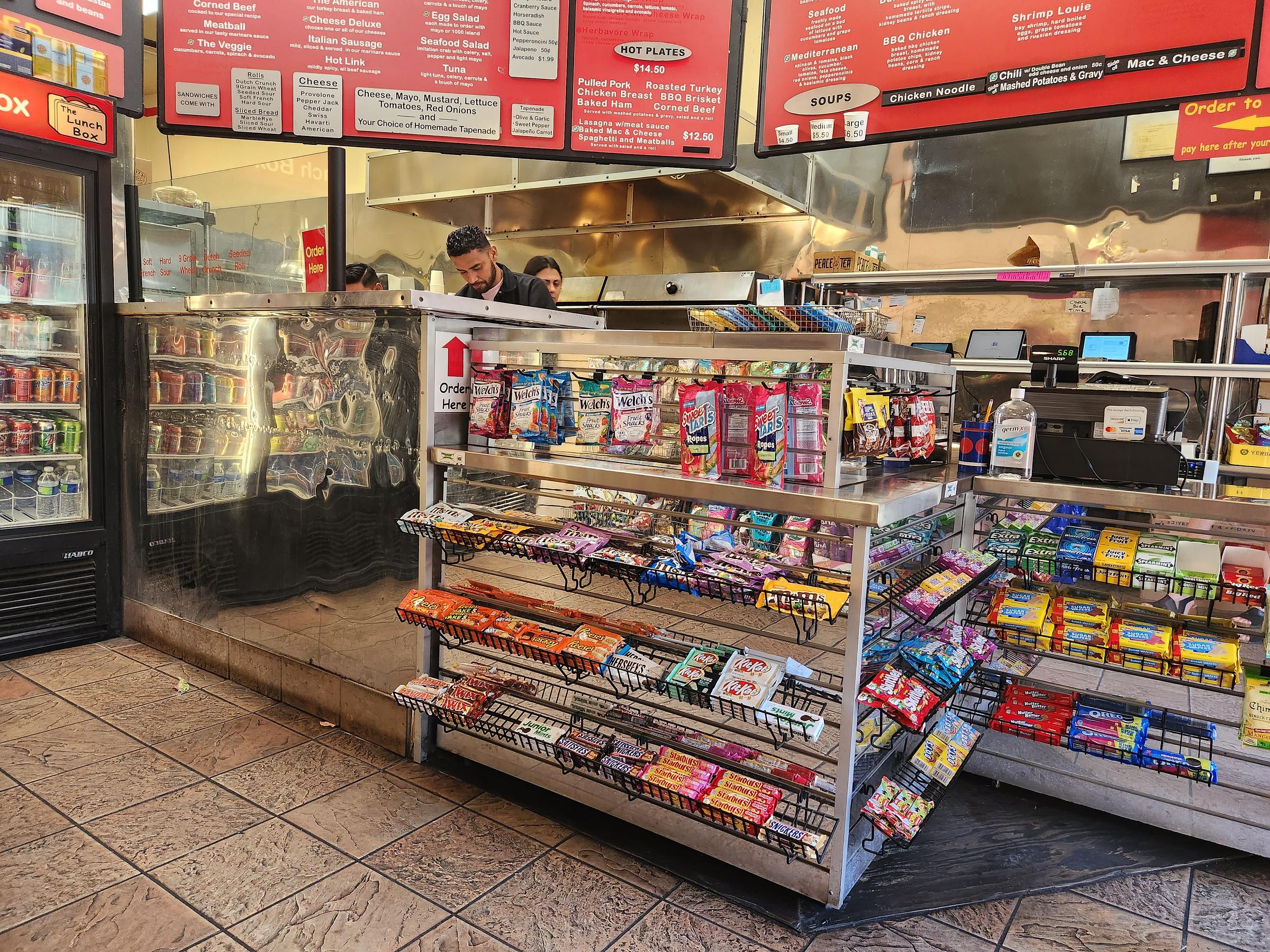 The small space had plenty of beverage choices in the fridges and a mini-corner store of chips and candies on offer, along with the empty boxes and cramped feeling of one. Ordering was quick and friendly, and as everything was served to-go. The POS does not include an iPad. There was not an obvious way to tip via credit card, making our meal, two sandwiches and sparkling waters, under $34. For a house-made pork sandwich this feels like a great deal; for a veggie one, less so.