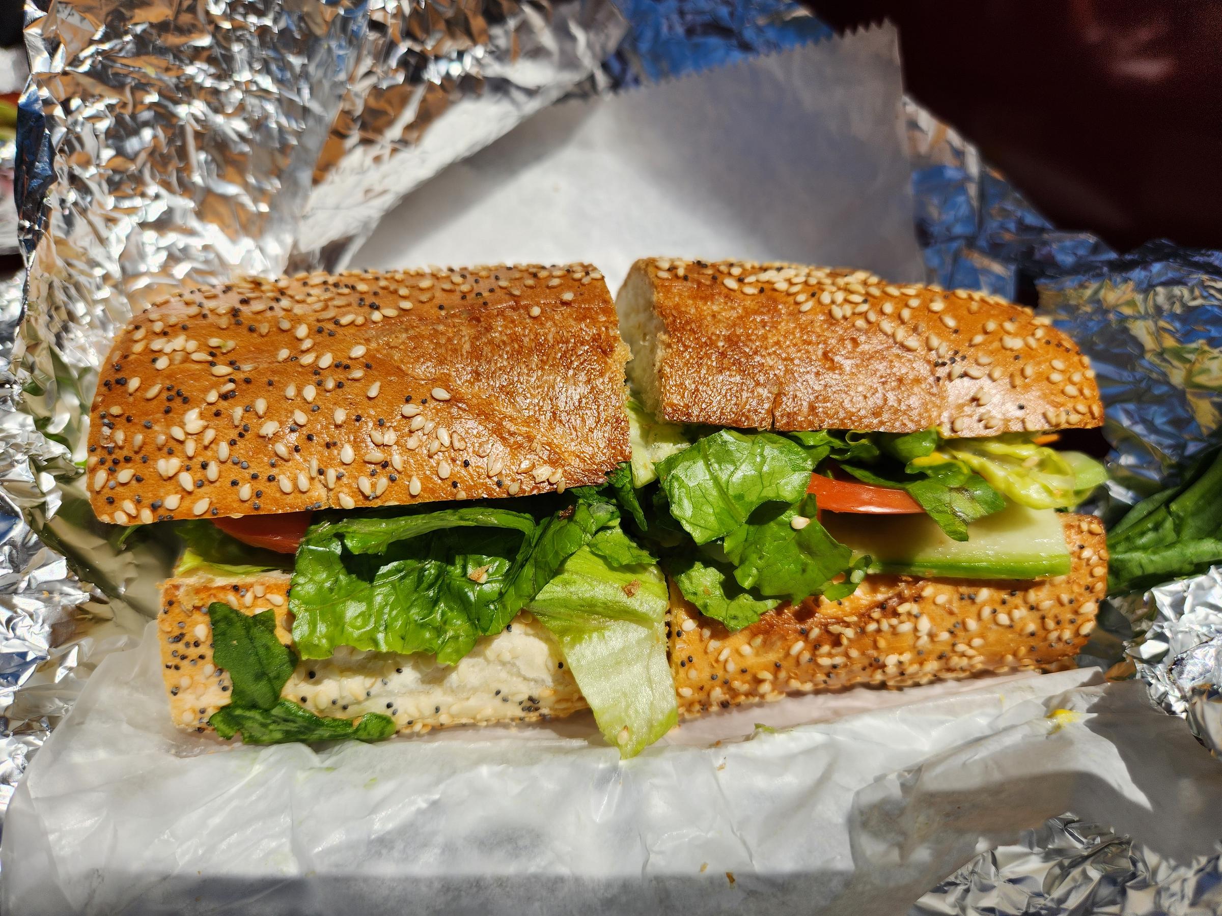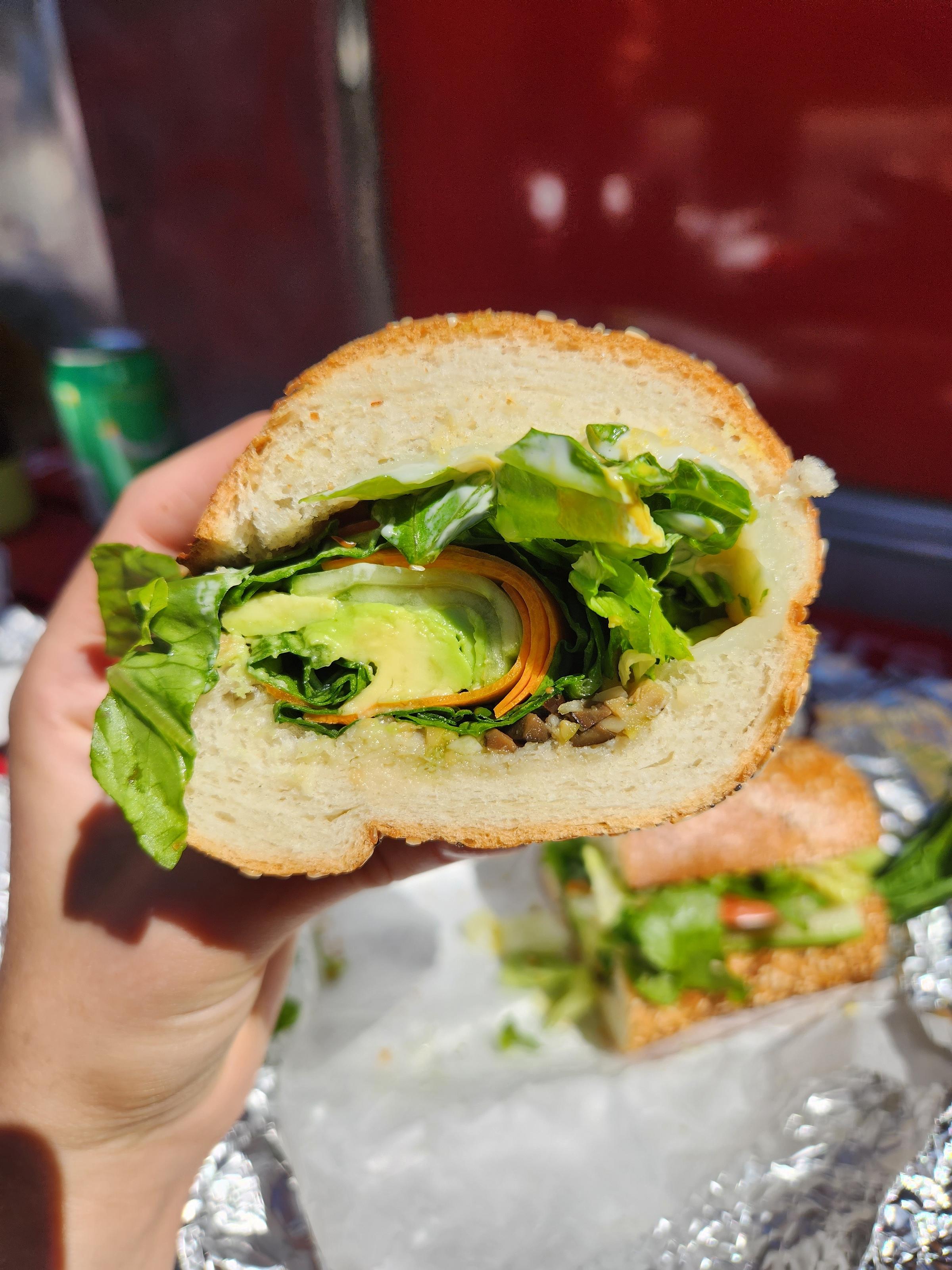 I was struck by the relatively small number of ingredients used in my sandwich — lettuce, tomato, avocado, carrot, cucumber, cheese, and mayo, as well as an olive and garlic tapenade I had added. The swirl of veggies was aesthetically pleasing, but again, hinted at what might be missing.