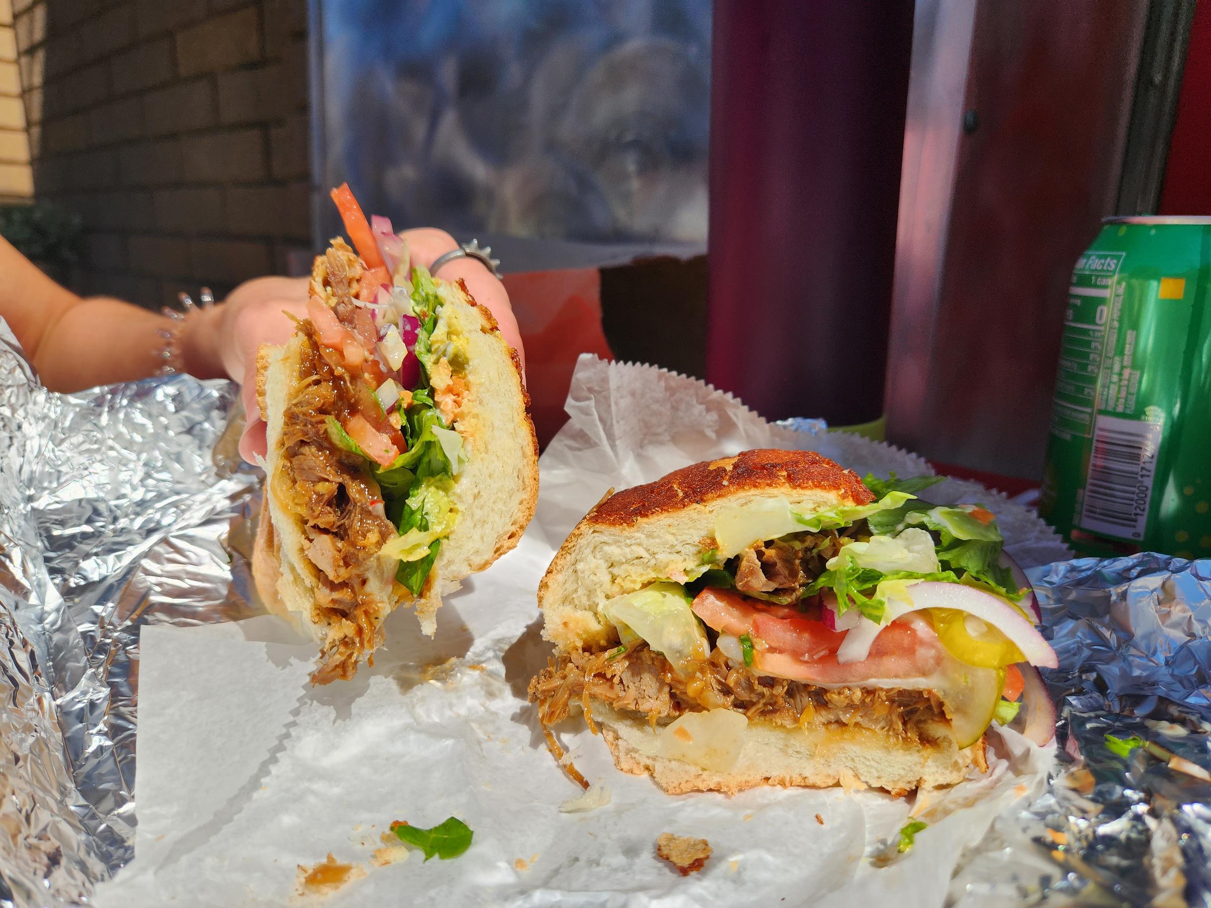My friend Simone ordered the pulled pork, also with “everything,” and was wise enough to request the free pickles tossed on there too.