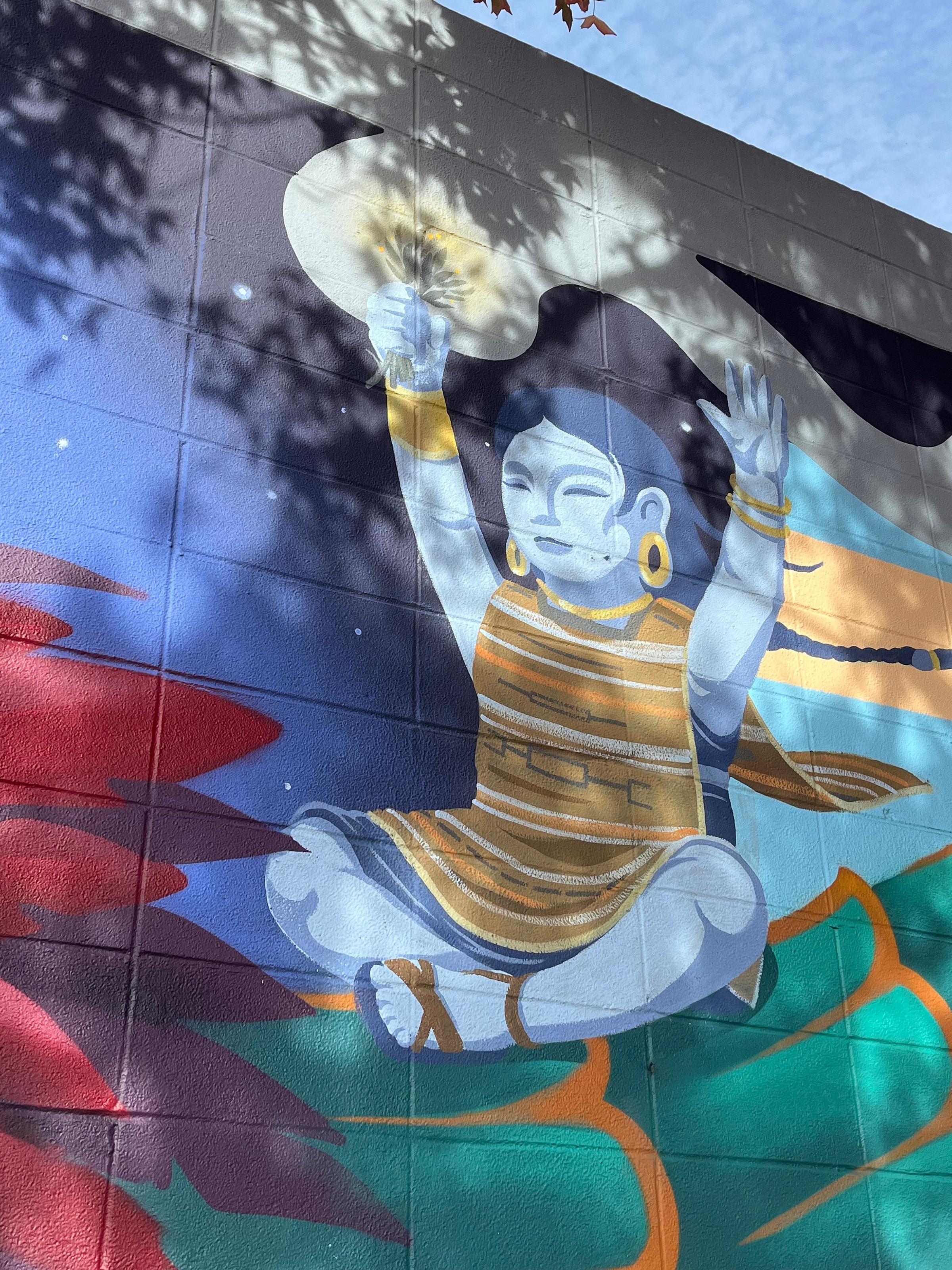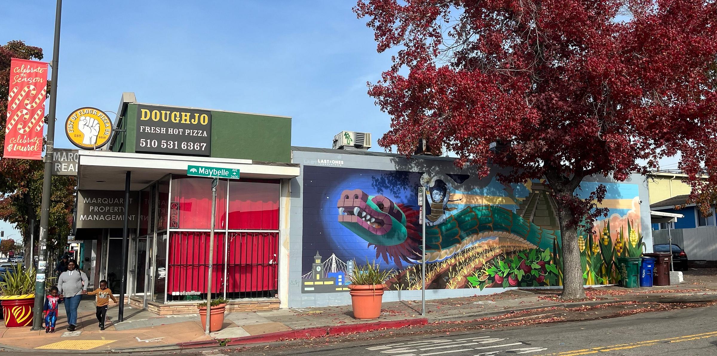 The mural is beautiful: an enormous quetzalcoatl ribboning the length of the wall on Maybelle Avenue and MacArthur Boulevard in Oakland’s Laurel District. Rendered with a blockiness complimented by the cinderblocks of the wall, the feathered serpent is ridden by a peaceful-looking figure over depictions of the Oakland cityscape and rows of corn and tomatoes, its tail wrapped around an Aztec temple. Day and night are both represented. Although it’s dazzlingly present, it’s also somehow unobtrusive – a part of the neighborhood. Its conspicuousness is also its hiddenness. But my own eye is arrested by the mural every time I see it.