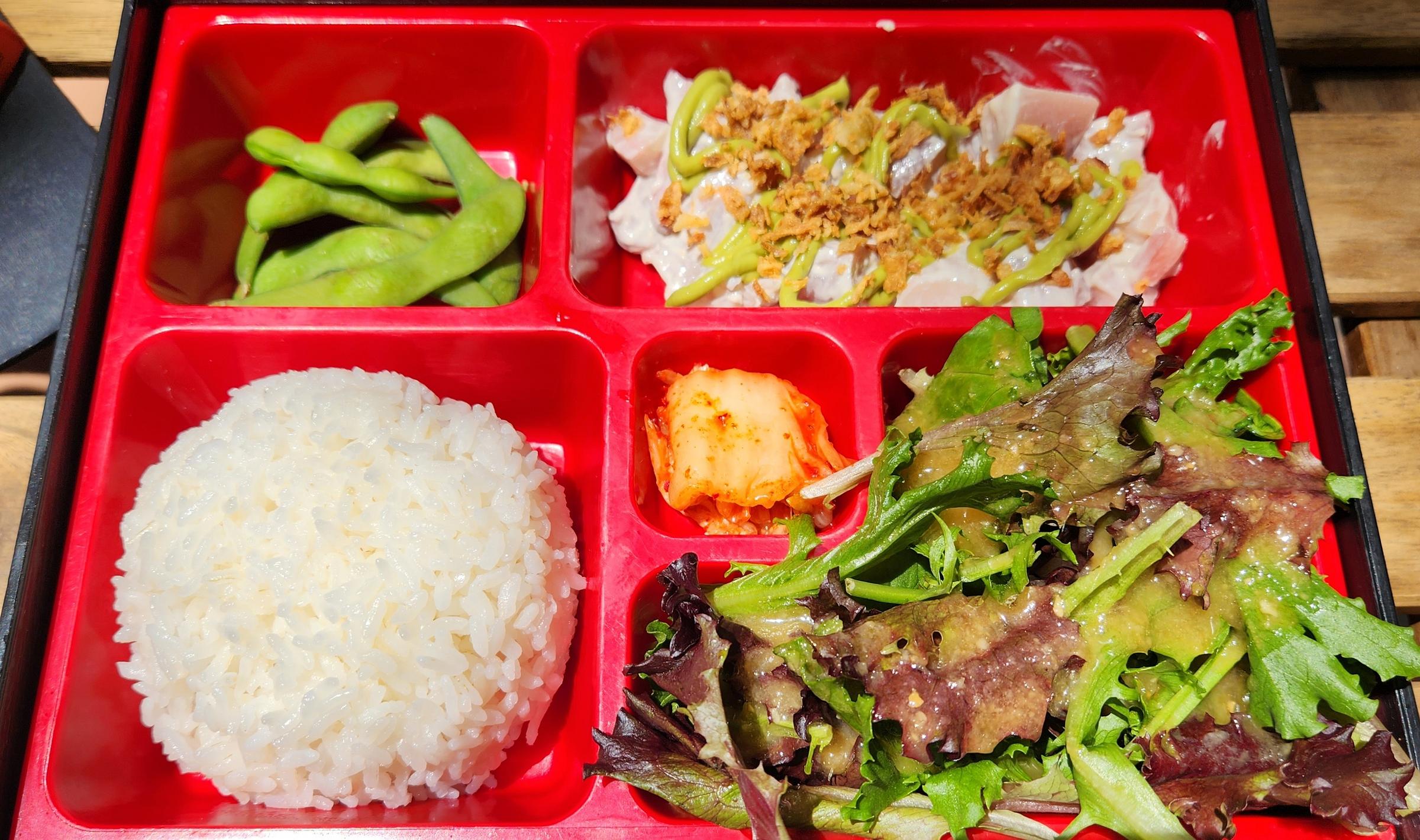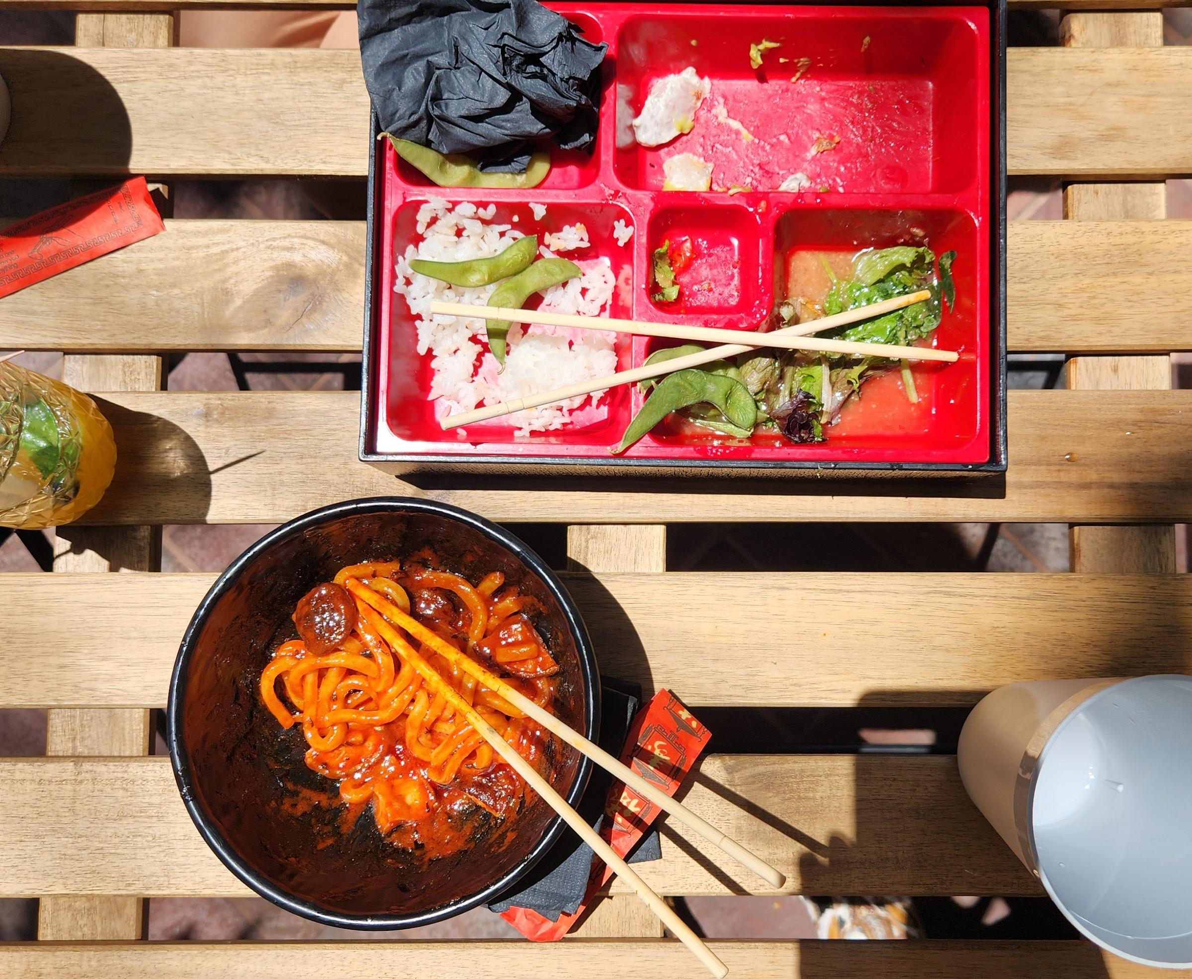 A short while later our buzzer went off, and Simone went to fetch our meals. She returned with a bowl of vibrantly sauced noodles for me and a sweet box of rice, edamame, kimchi, salad, and pokè for her.