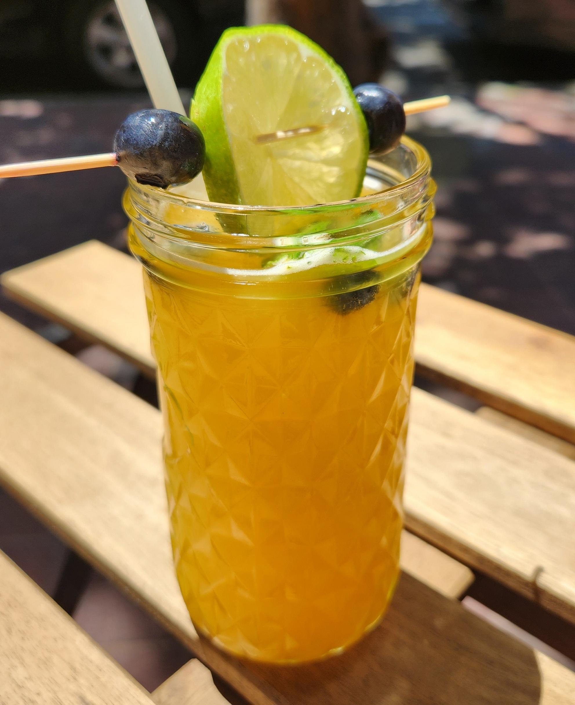 We filled our waters, disposed of the trash left on the outdoor table, then sat in the sun with our buzzer. A few minutes later, the server brought Simone a lemonade garnished with a lime slice and blueberries skewered with a tiny gold ball.