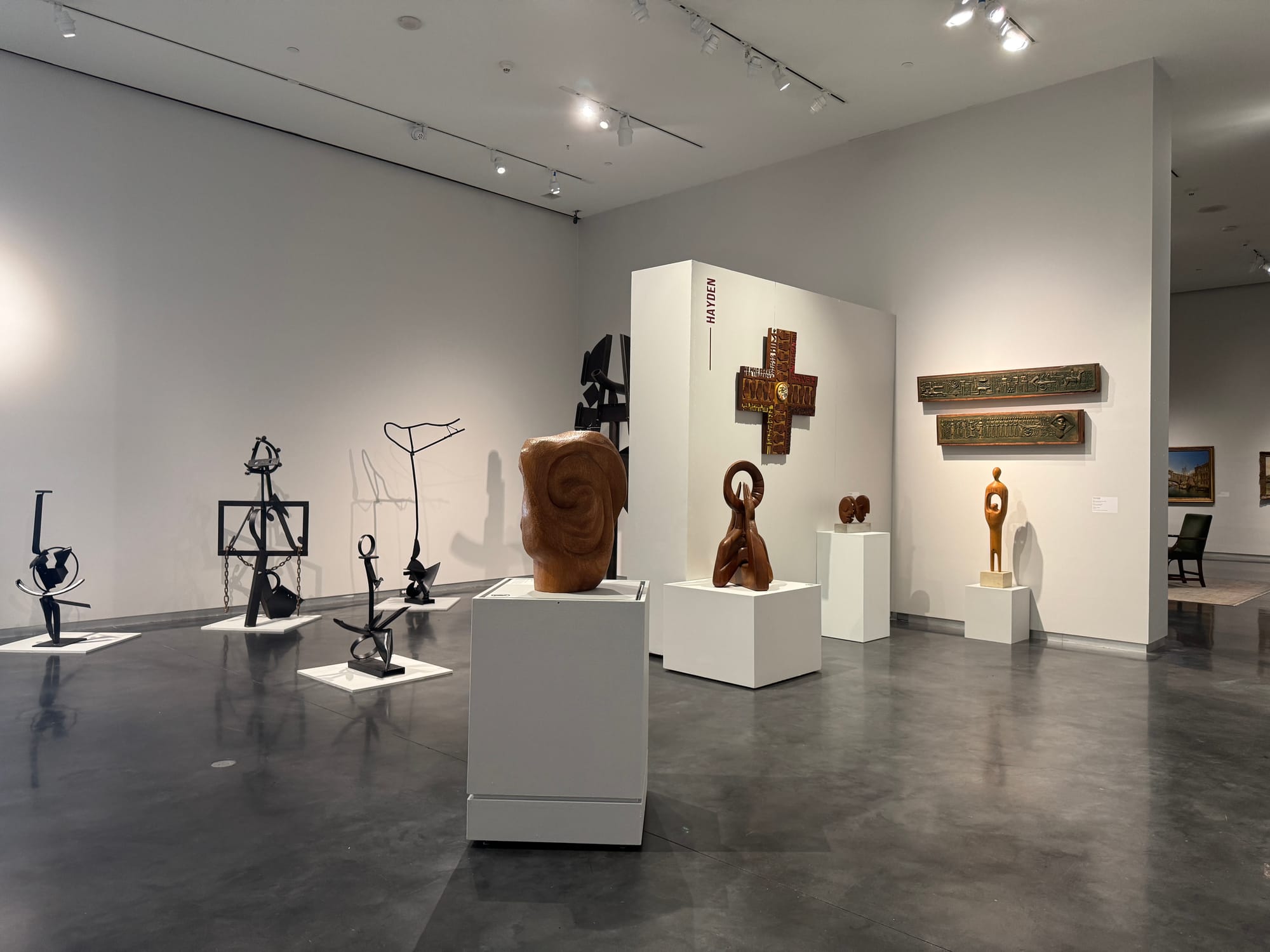 If you walk to the left side from the welcome desk at the LSU Museum of Art, you’ll enter a room with sculptures in vastly different styles. A group of discarded steel sculptures cast shadows on the white walls. In stark contrast, there are a group of colorful rainbow painted aluminum sculptures sitting on pedestals that look like they could burst into movement at any moment, a set of wooden sculptures with religious iconography and a wall full of black mirrors cast out of paper.