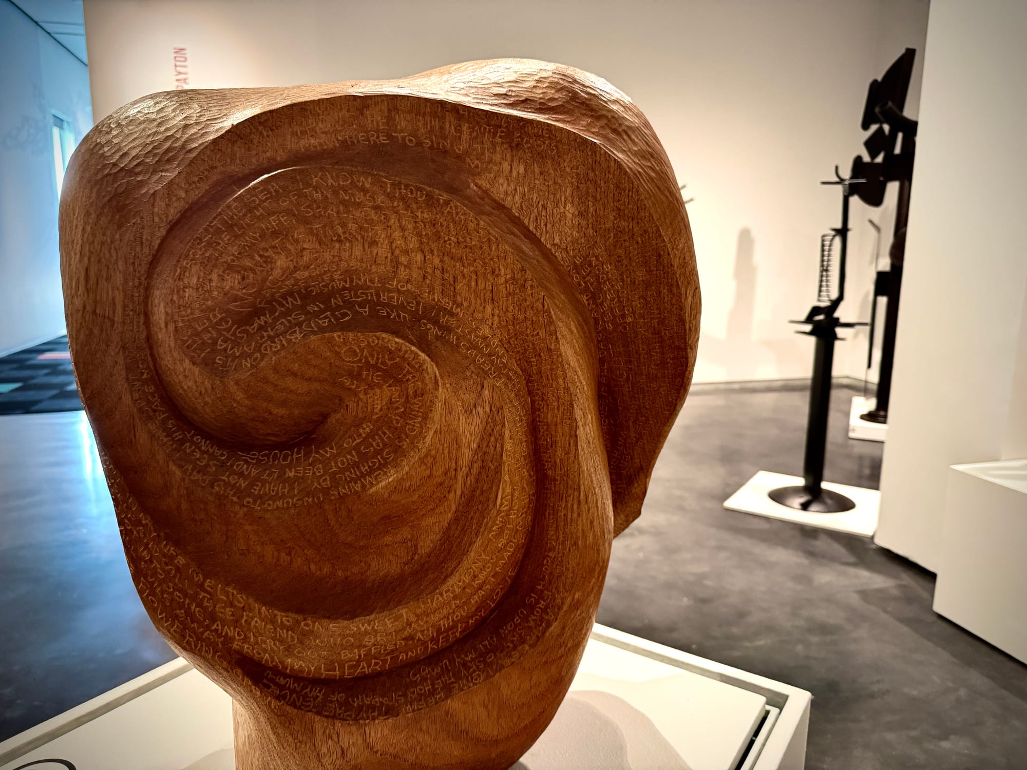 A striking piece within the exhibit is “Tagorean,” an undated wooden sculpture that is part of the Louisiana Art & Science Museum’s collection which sits in the middle of the room. It’s inspired by the spiritual poetry of Bengali Nobel Prize winner, Rabindranath Tagore (1861-1941). The first five poems from his “Gitanjali” (Song Offerings) are carved into the wood emerging from the figure’s mouth, wrapping around and swirling on the back of his head. Tagore may not be as familiar to people as Mahatma Gandhi, but he played a leading role in the Indian cultural renaissance and is credited as one of the architects of modern India. The handcarved lettering feels raw, and the piece creates curiosity about Tagore.