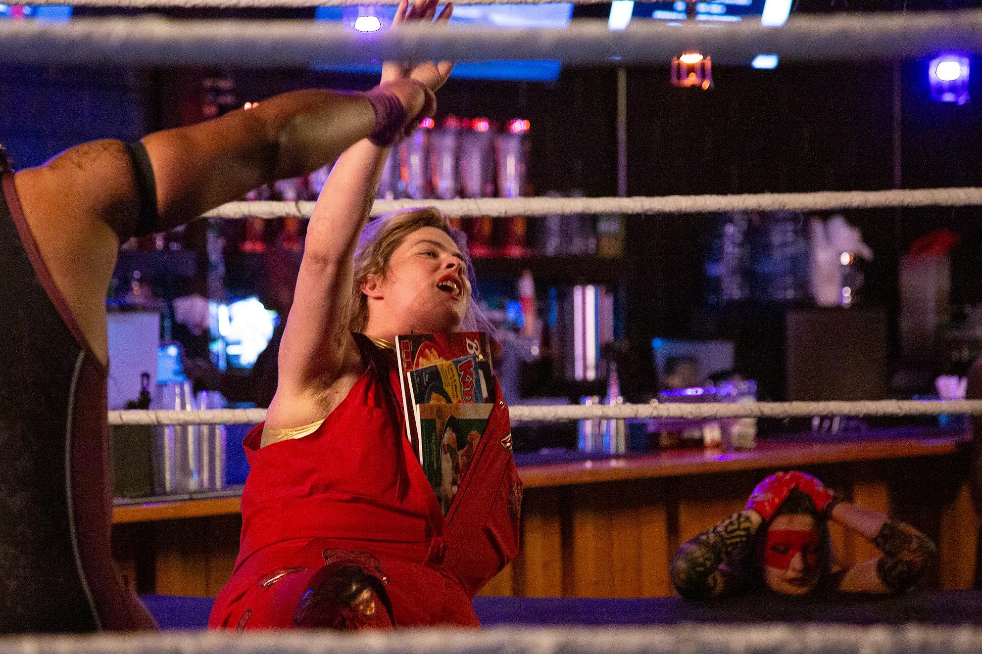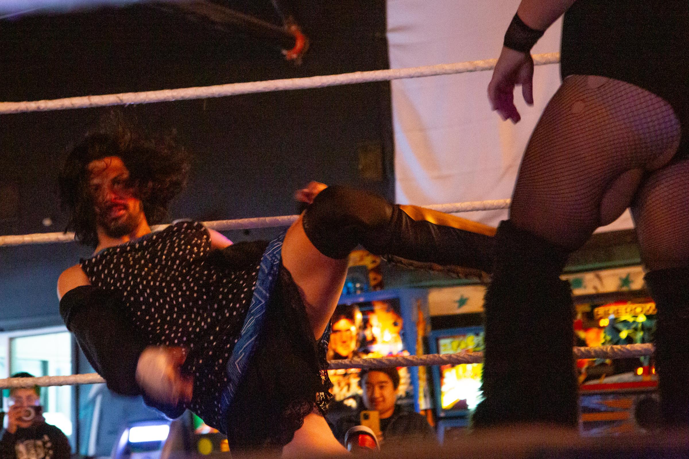 The scene was 7th West’s large interior. I stumbled inside to find a wrestling platform occupying roughly a third of the available floor space. Tables and chairs ringed the room, nearly all full, the referee’s hot-pink hair illuminating the dim space.