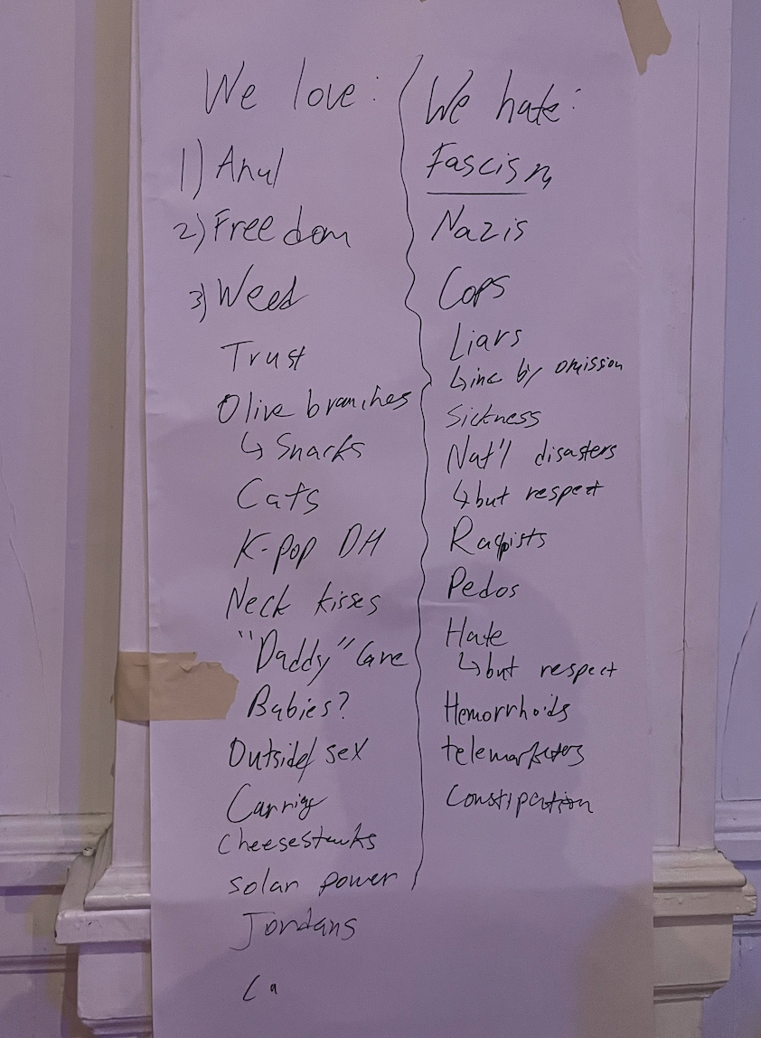 Our likes included: anal, freedom, weed, trust, olive branches, outdoor sex and solar power. Dislikes began with fascism and lying, then branched out to include hemorrhoids, constipation, and cops. Just like that, we had started a fresh nation.