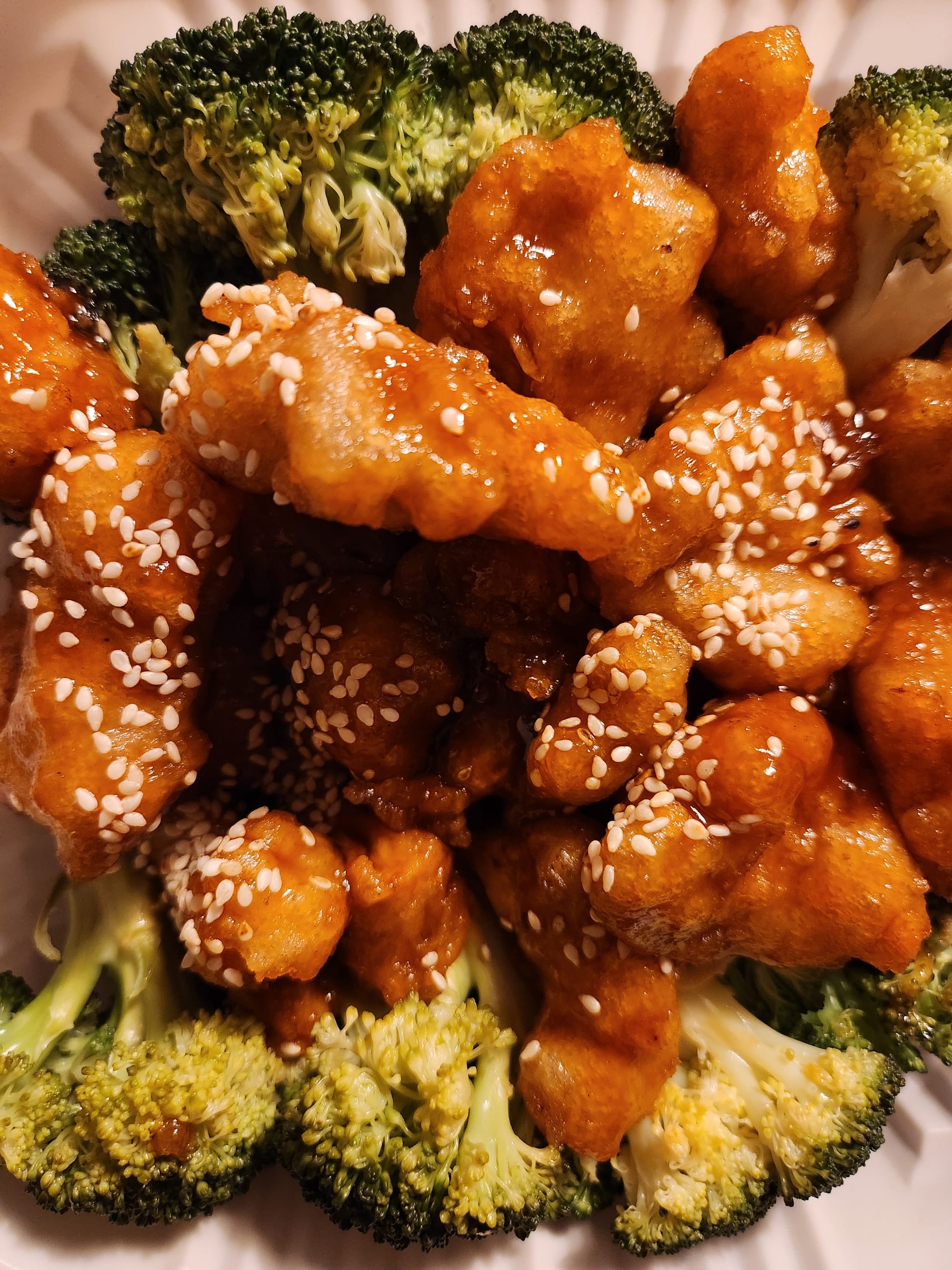 For a quick bite of heartier fare, to hold down the soup, some sesame chicken. Immediately upon biting in I regretted the choice, wishing for the “spicy” veggie General Tao’s instead, but the nuggets were very good: a nice ratio of sticky sauce to crunchy battered gluten puff with the accompanying steamed broccoli, a little wet, bringing a clean simplicity and funky cruciferous depth cuts the sweet richness of the sauce.