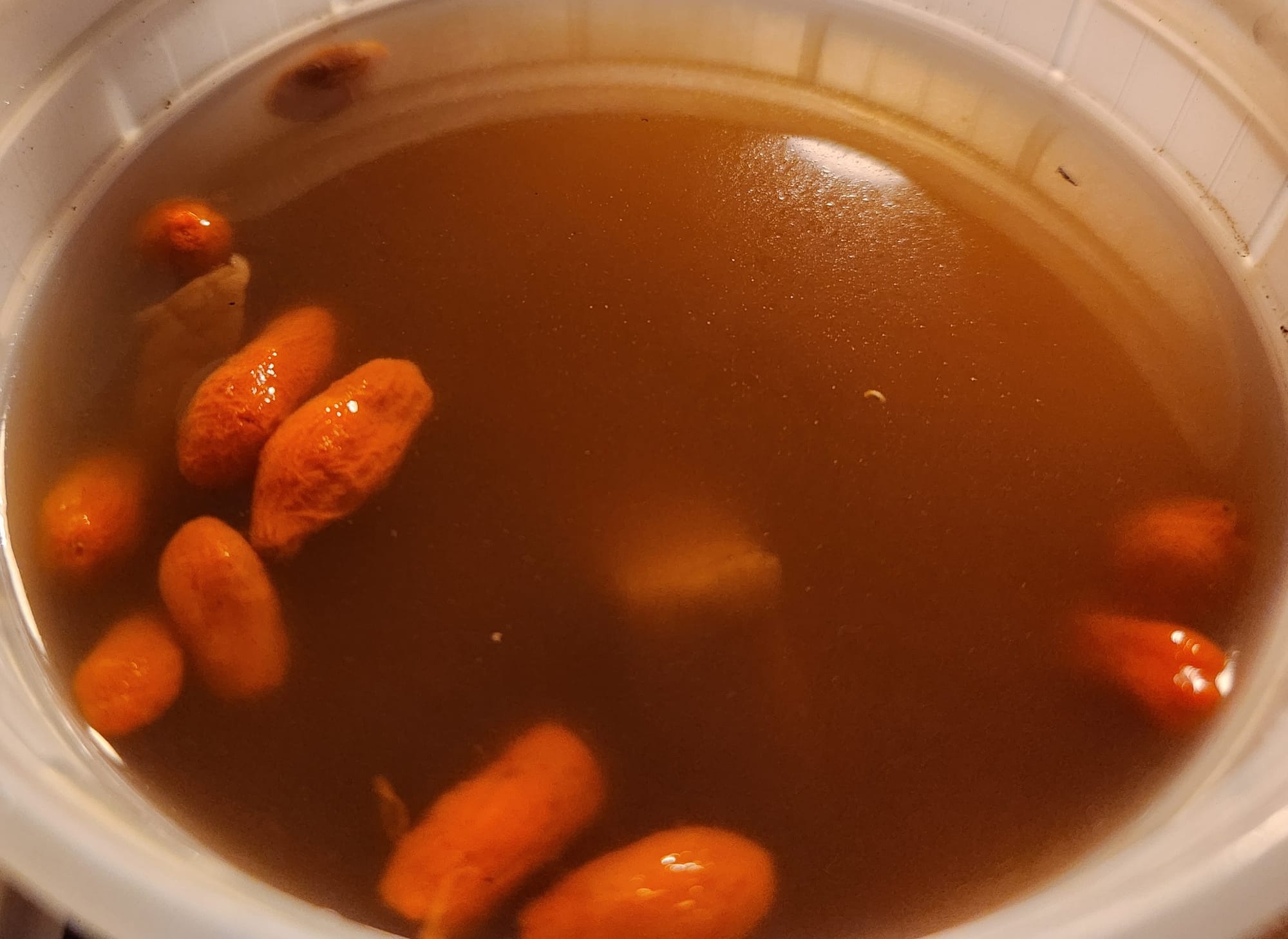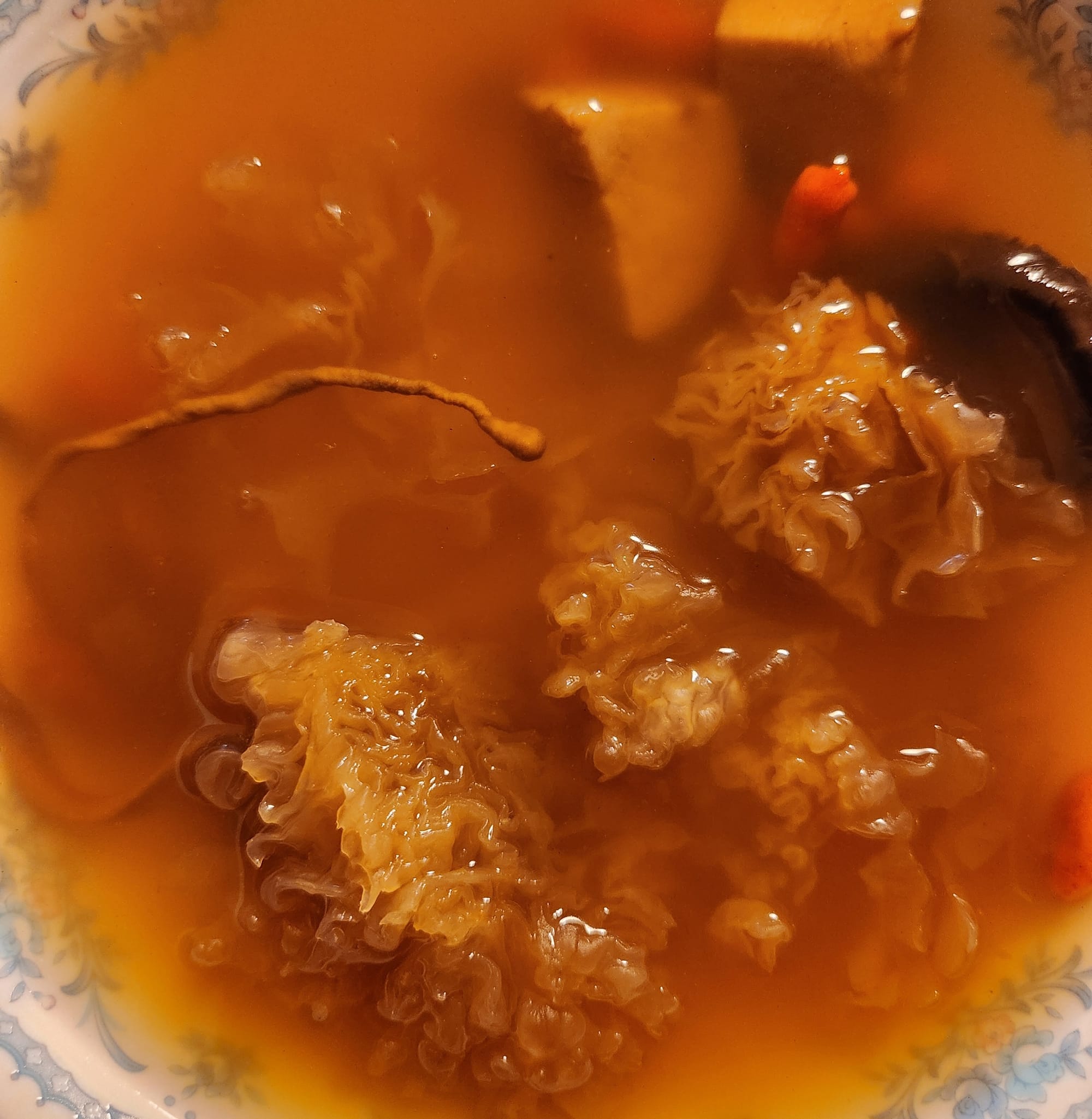 The berries, soft and squishy to the touch (yes, I stuck my fingers in to find out, sorry), were accompanied by crescents of a vegetable. Eggplant? No. Soft and slightly rubbery with lots of give. Also cordyceps, or another fungi, like tapeworms for good. Lastly, a fleshy pulpy, billowingly tripe-like and citric in one. White (jelly) fungus, it appeared, citrusy and celery-esqe, lightly sweet. The broth, light and vegetal, mild, almost tea-like.