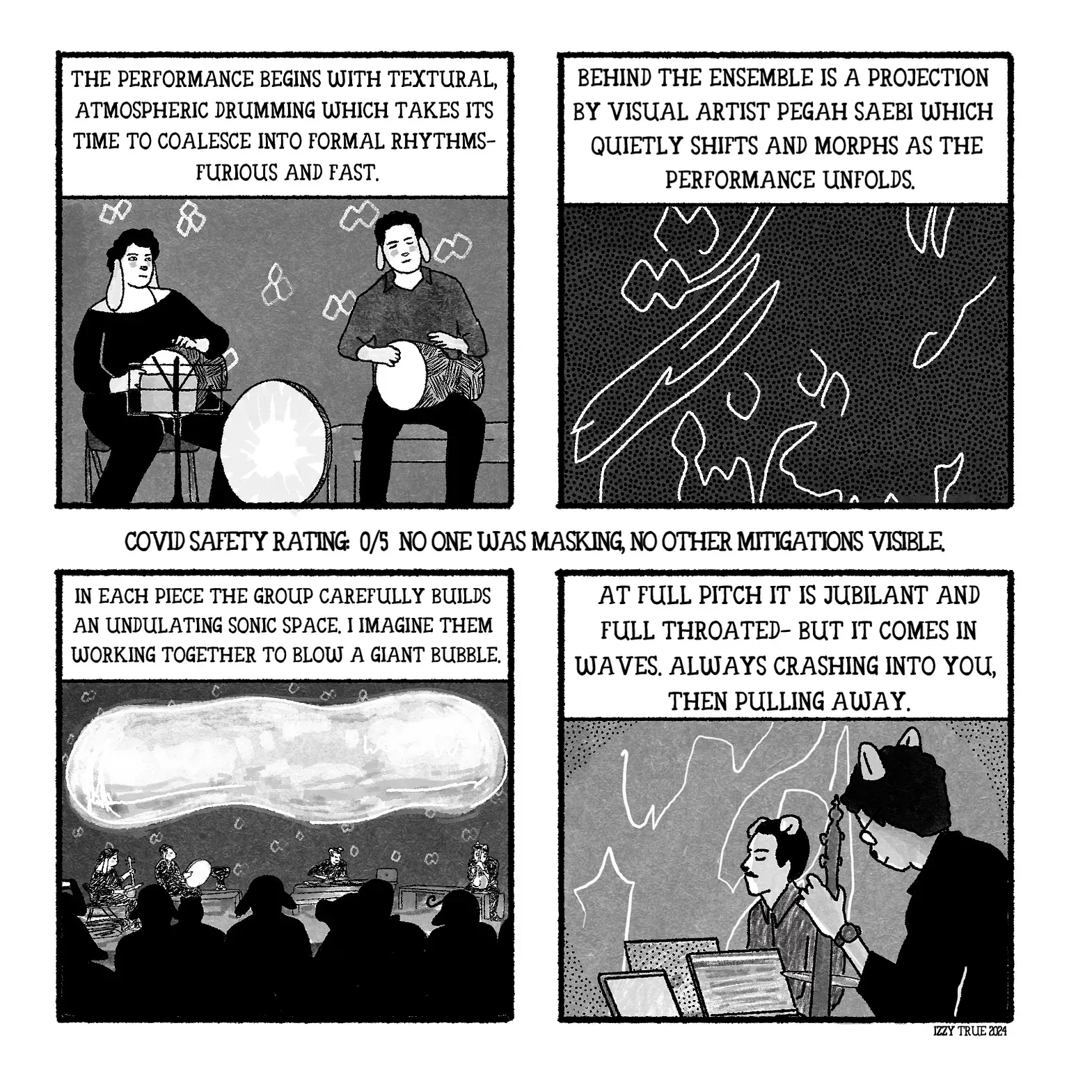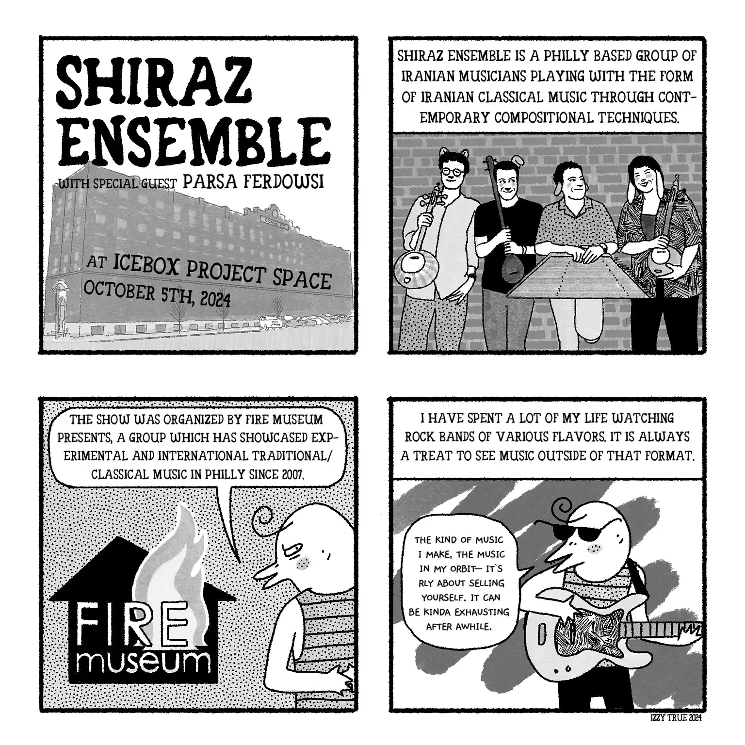 Philadelphia Shiraz Ensemble Breaks Form Izzy's review in comics of Shiraz Ensemble at Icebox Project Space Izzy True 14 Oct 2024 · 1 min read Shiraz EnsembleIcebox Project Space1400 N. American St.PhiladelphiaOct. 5, 2024