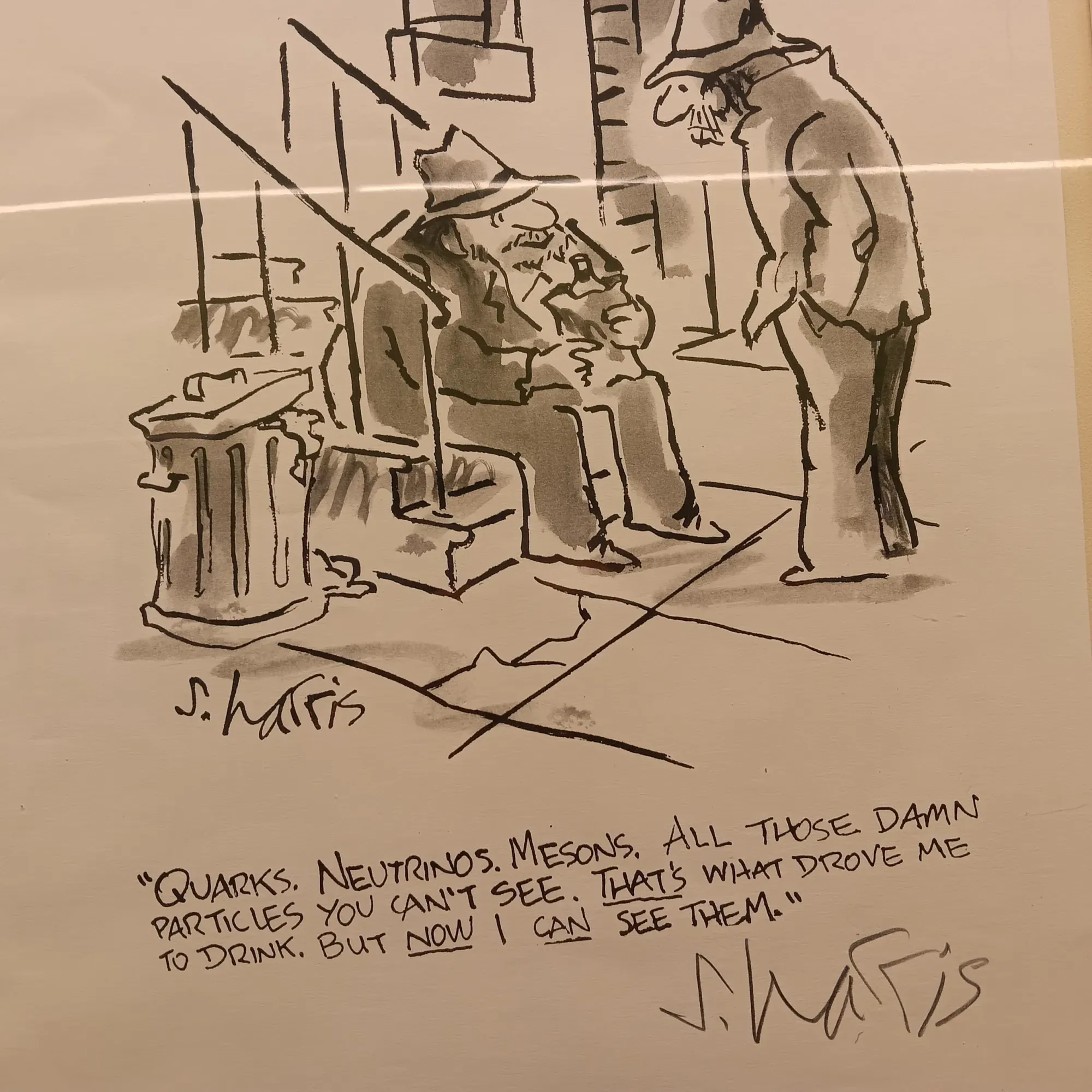 So Harris retired. That is, he stopped poring over, for example, scientific tomes and journals and reading and reading often long hours into the night, until something clicks, something that would work as a cartoon; and only then would he reach for the pen and begin to draw.