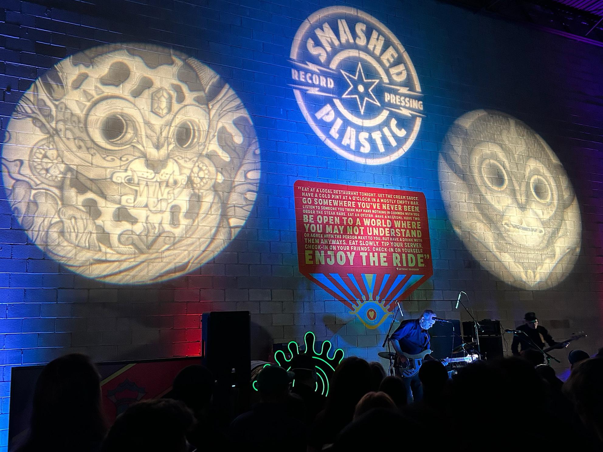 Above the stage was a painted quote by Anthony Bourdain and two projected moons, as well as a projected and lightly bouncing Smashed Plastic logo; while we milled in the half-lit warehouse, Tiny Tim’s “Tiptoe Through the Tulips” played from the other half of the warehouse, lending a momentary uncanniness to the event. After enough time for an impromptu bathroom break and lap around the warehouse, looking at innumerable unidentifiable boxes and a field of commercial espresso machines, Dianogah took the stage again, claiming “we only know our set from the beginning, so here we go.” While they didn’t do more than another song or two, they shouted out both their children in the crowd — a teen wearing bright pink headphones raised their fist joyfully — and elicited some lighthearted jeers at a Smashed Plastic employee the band jocularly blamed for the delayed release of their forthcoming album.