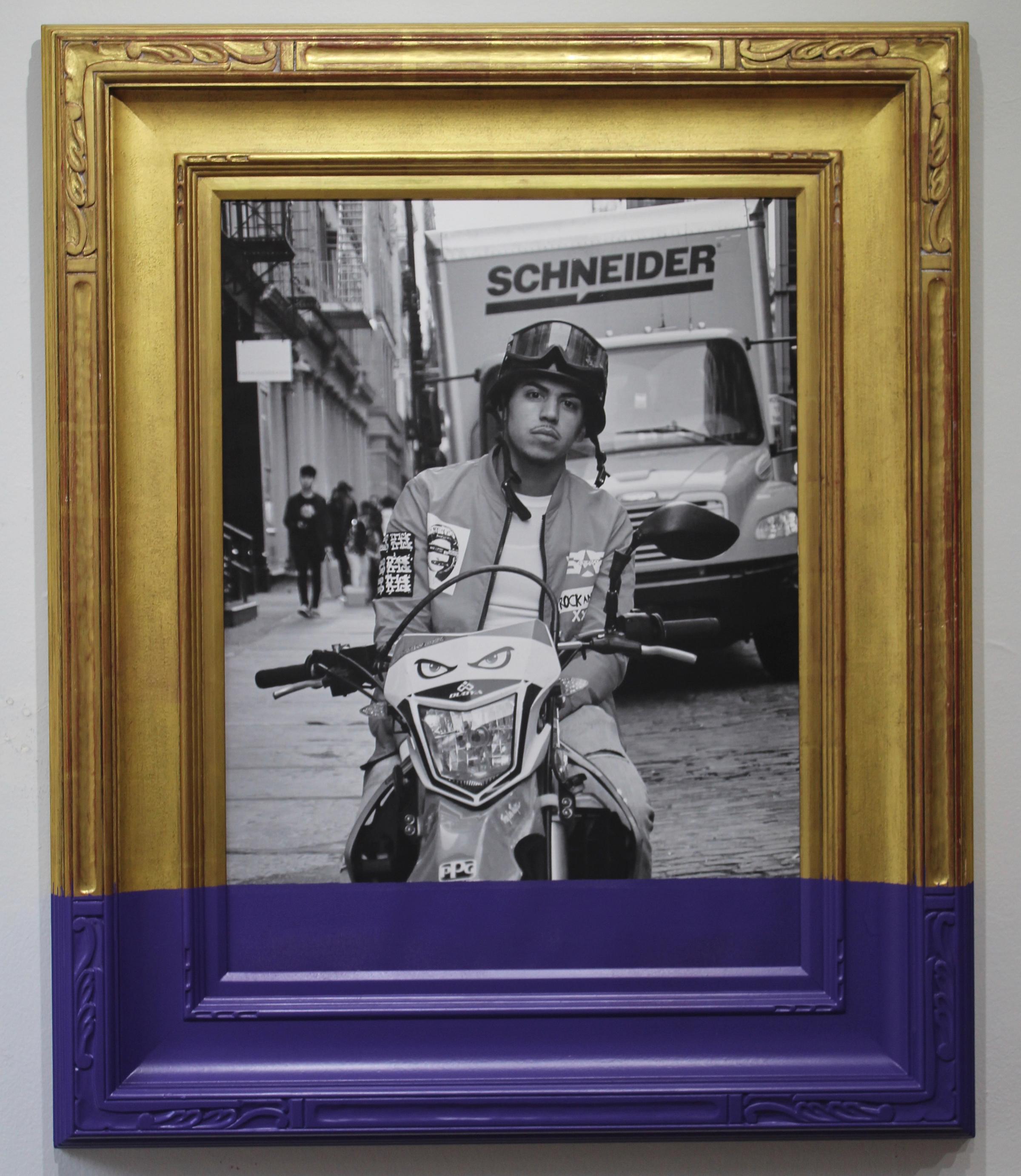 Recinos’s ability to capture a striking image no matter where he goes is never in doubt — and judging from the photos in his show, he gets around. The vividness of the stripes of color and their placement on the photo and frame work at odds with one another in intriguing ways. If the colors were darker, or if the paint were allowed to drip, there might be more of a sense of menace about it, an encroaching of something onto the subject of the photograph. But the popping colors make it about something else. They make the images feel like something more like a series, in almost a branding exercise. The photographs are of disparate subjects, from marchers to laborers. The stripes of colors unite them into a whole, inviting a viewer to find connections, too, perhaps to open the door to empathy.