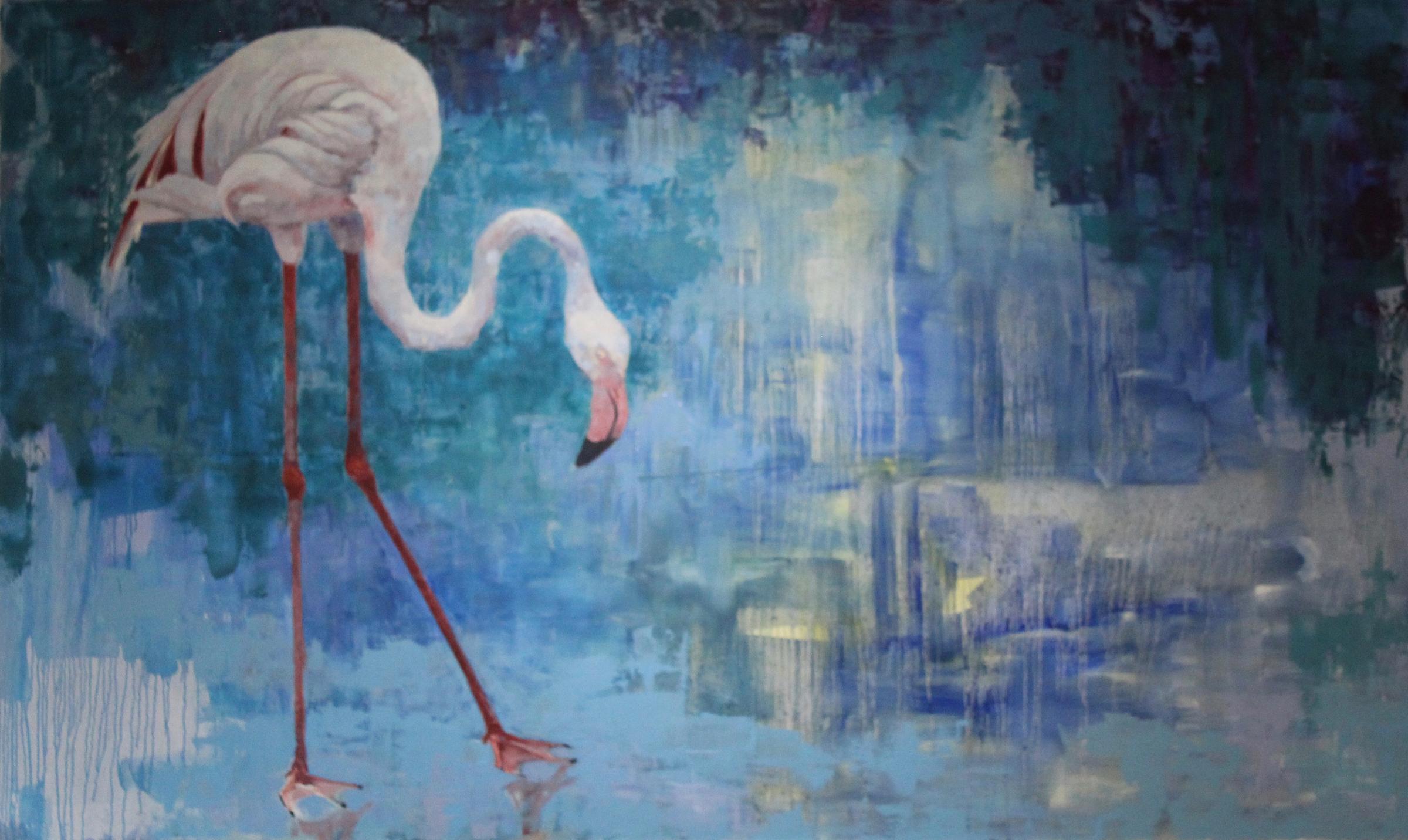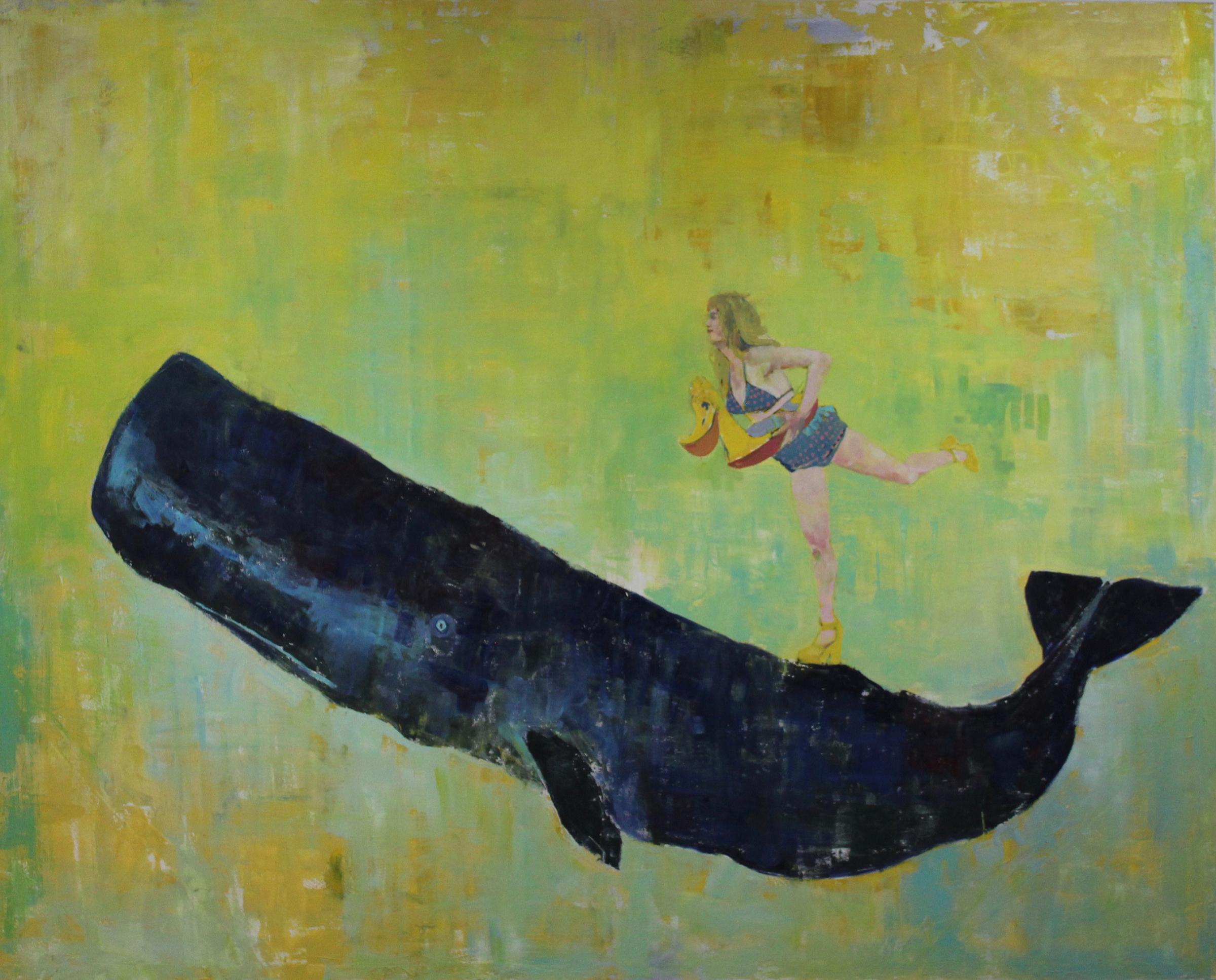 Stephens’s stated willingness to move from medium to medium informs his strict paintings, which have a sense of collage about them. In both As Soon as the Sun Comes Up and My Lucky Charm, the figures are essentially pasted as crisp images onto luminous but abstract backgrounds. And while Charm’s bird droops its head toward the ground in a gesture of melancholy not often seen in animals, the woman riding the whale (completely out of scale) is in a precarious spot, as though the whale will soon turn and take its revenge.