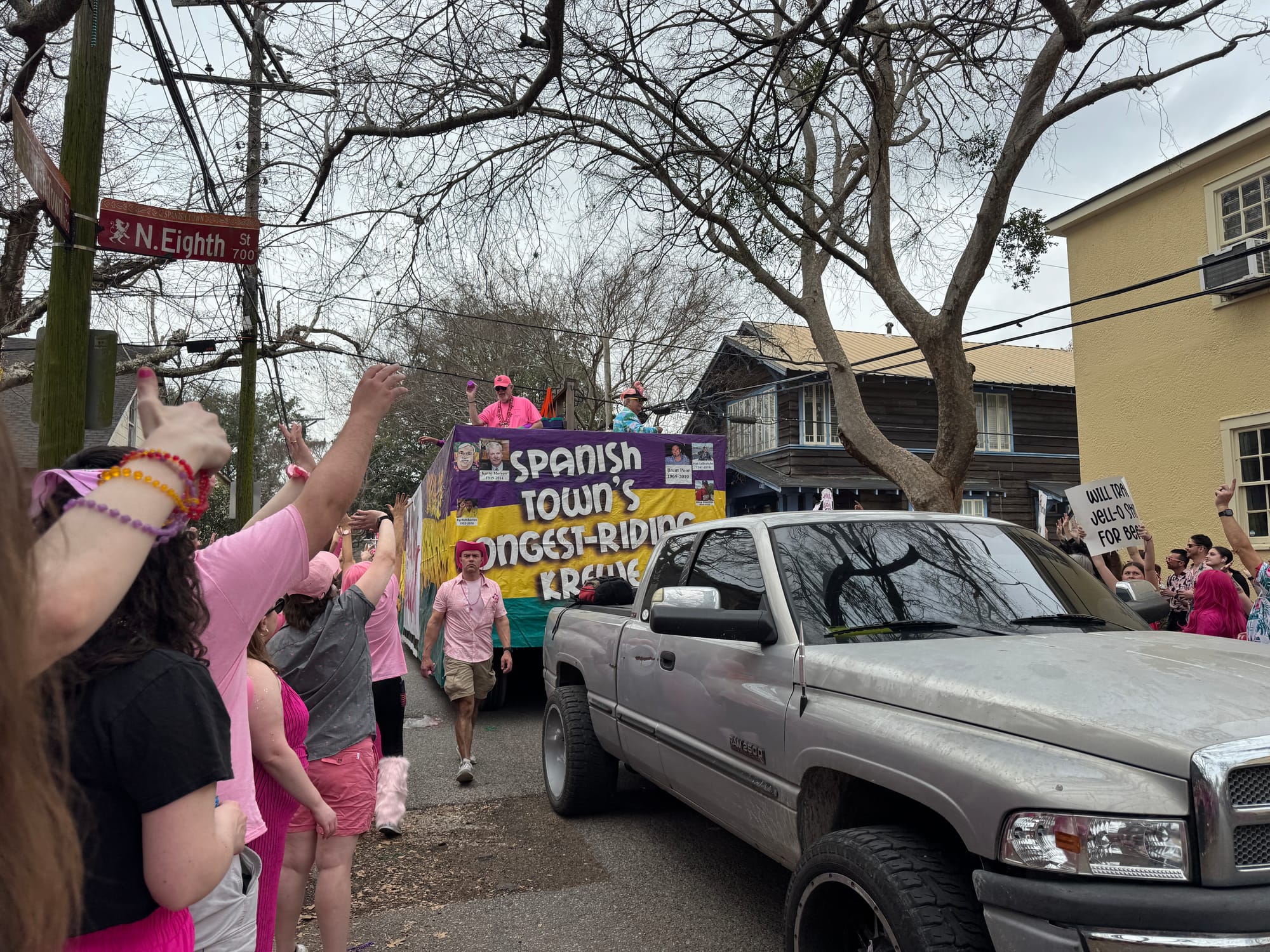 The first throw I caught at the Spanish Town Parade this year was a pair of fuzzy pink handcuffs. A sea of thousands of people clad in pink gathered downtown, beads were in the air, and floats were full of boob stress balls, penis beads and toys/stuffed animals for little kids — because in typical Spanish Town fashion, there were a ton of kids there.