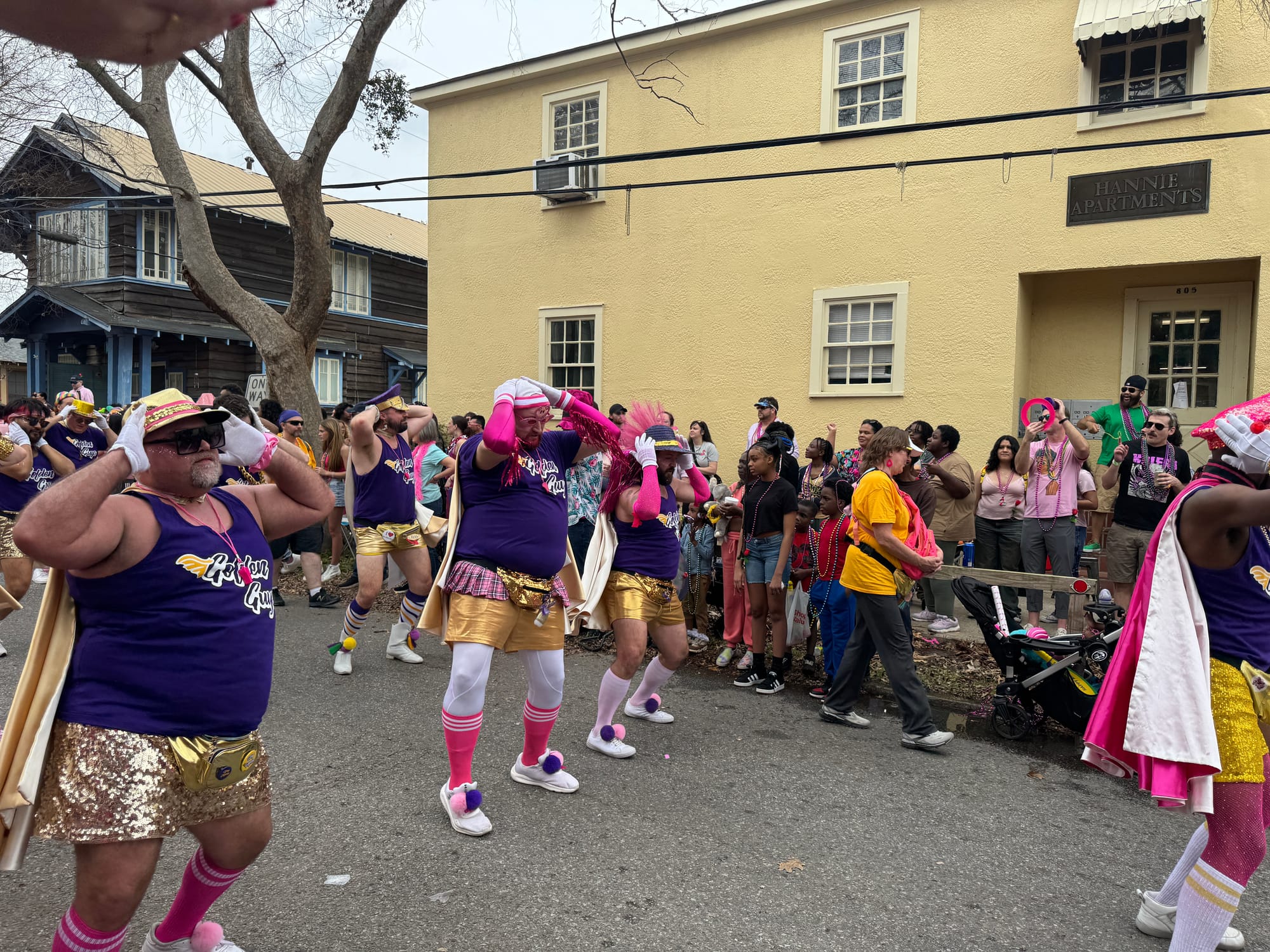 This year's parade featured floats adorned with conversation hearts and the neighborhood’s signature pink flamingos. The Golden Guys, an all-male dance troupe, performed in their signature LSU colors with pink socks and poms poms on their shoes. Street vendors hawked feather boas and glow sticks. People broke out their shiniest, pinkest and most provocative outfits for the parade.
