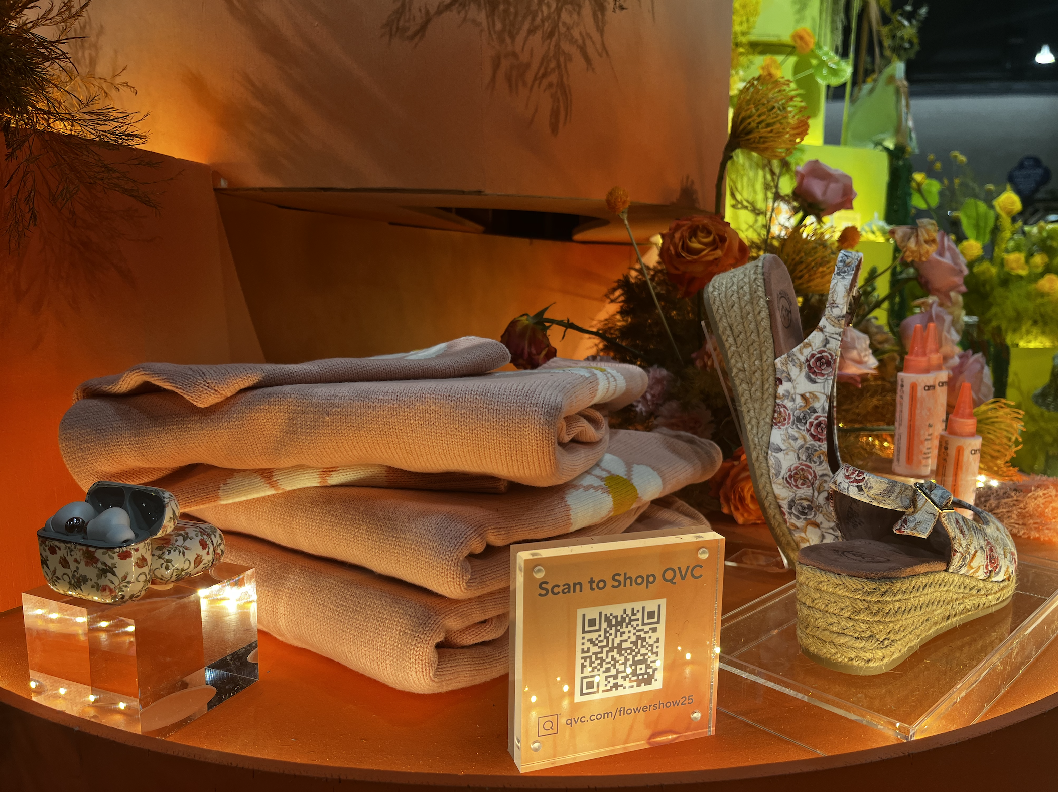 “Visit the garden shop for exclusive bargains on tomorrow’s gear,” a robotic voice injected itself through warehouse air thick with allergens and artificial bird sounds. Patrons lined up at a “Bloom Bar” to get fitted for flower crowns. Mushroom tinctures touting adaptogenic benefits were on sale at crouched-down booths seemingly positioned around every corner of the maze. Television Network QVC styled a rosy centerpiece to market AirPods, supplements, spyware birdhouses and other invasive homegoods.