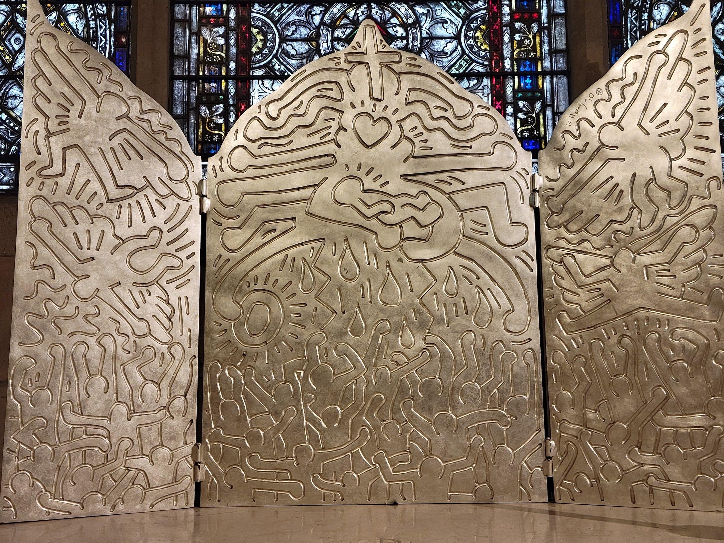 In his final days before dying of AIDS in 1990, artist Keith Haring drew in slabs of clay the triptych of “The Life of Christ.” It was his last work of art. After he died the tablets were cast in bronze, then covered in white gold. Nine were made, with the first one placed at St. John’s. His graffiti tag of the “Radiant Baby,” a child crawling with rays of energy, is flipped on its back to depict the Christ child, bringing joy into the world.