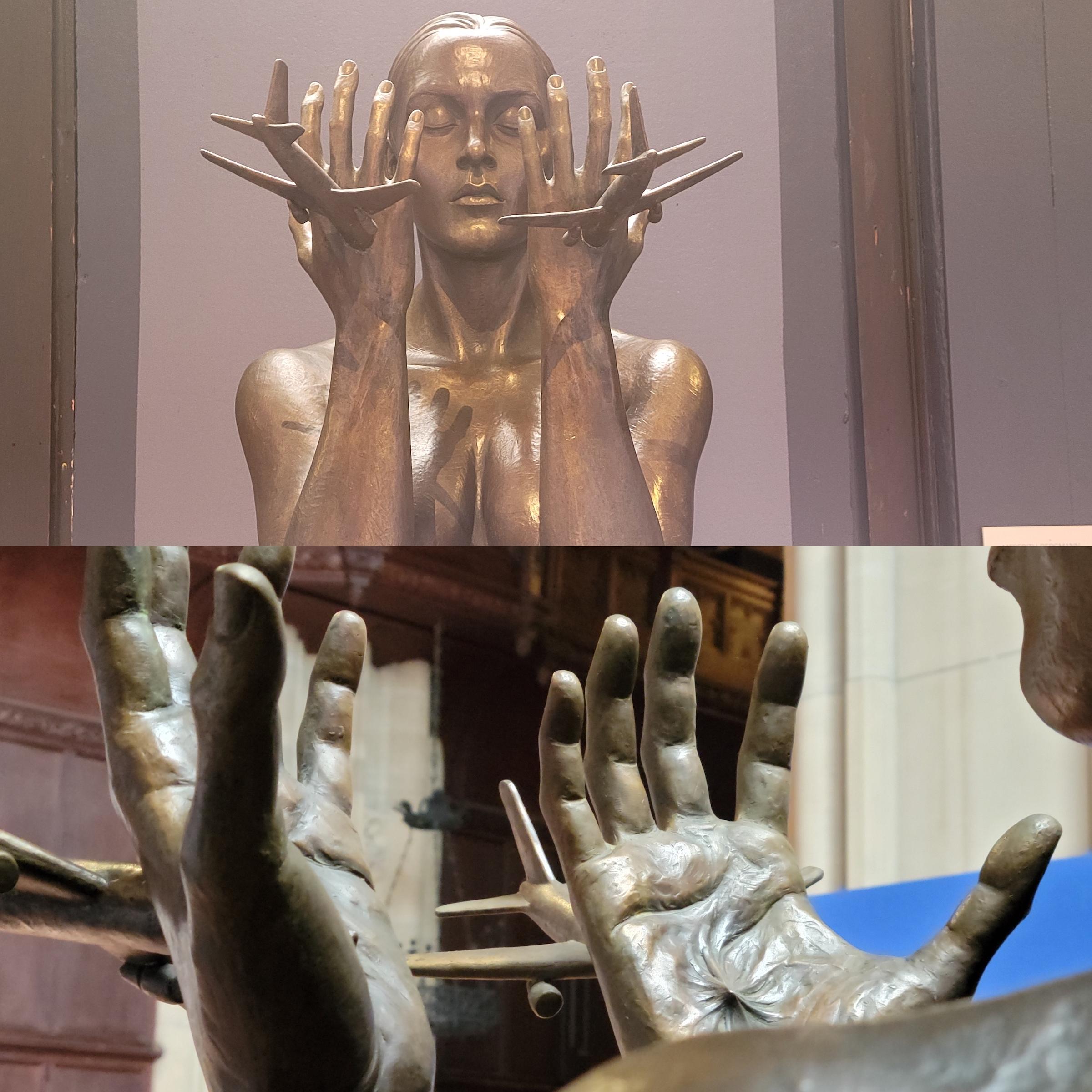 Meredith Bergmann’s sculpture is made of bronze, steel, glass, and a reliquary-like containment of rubble from the World Trade Center. The figure’s two arms are raised in parallel form, resembling the Twin Towers. The tips of the planes crash into the her hands held in an orans prayer position, forming stigmata, the marks of Christ crucified. Abraham interpreted this as representing protection and the creation of a space and “room for love.” Taking another perspective, I imagined that one day those who died in the terrorist attack may be seen as having sacrificed their lives to build greater understanding in the world.