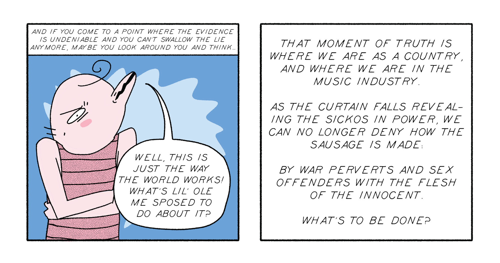 All Over Stop Swallowing The Lie In the wake of news like Wasserman Media Group's ties to Jeffrey Epstein, Izzy True reflects on how artists can fight against the evils of the modern day music industry. Izzy True 13 Feb 2026 · 1 min read