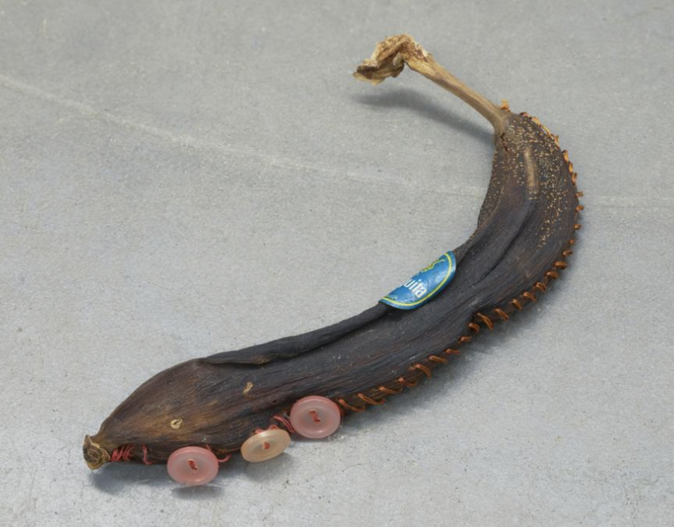 “I began sewing up banana skins and orange peels most mornings after breakfast. This act of repairing was helpful to me. The quiet, repetitive act of sewing was satisfying to me in some way I didn’t really understand. I didn’t think of this as making art at all,” Leonard wrote in an artist statement. “This act of fixing something broken, repairing the skin of something after the fruit of it is gone, strikes me as both pathetic and beautiful. At any rate, as intensely human.”