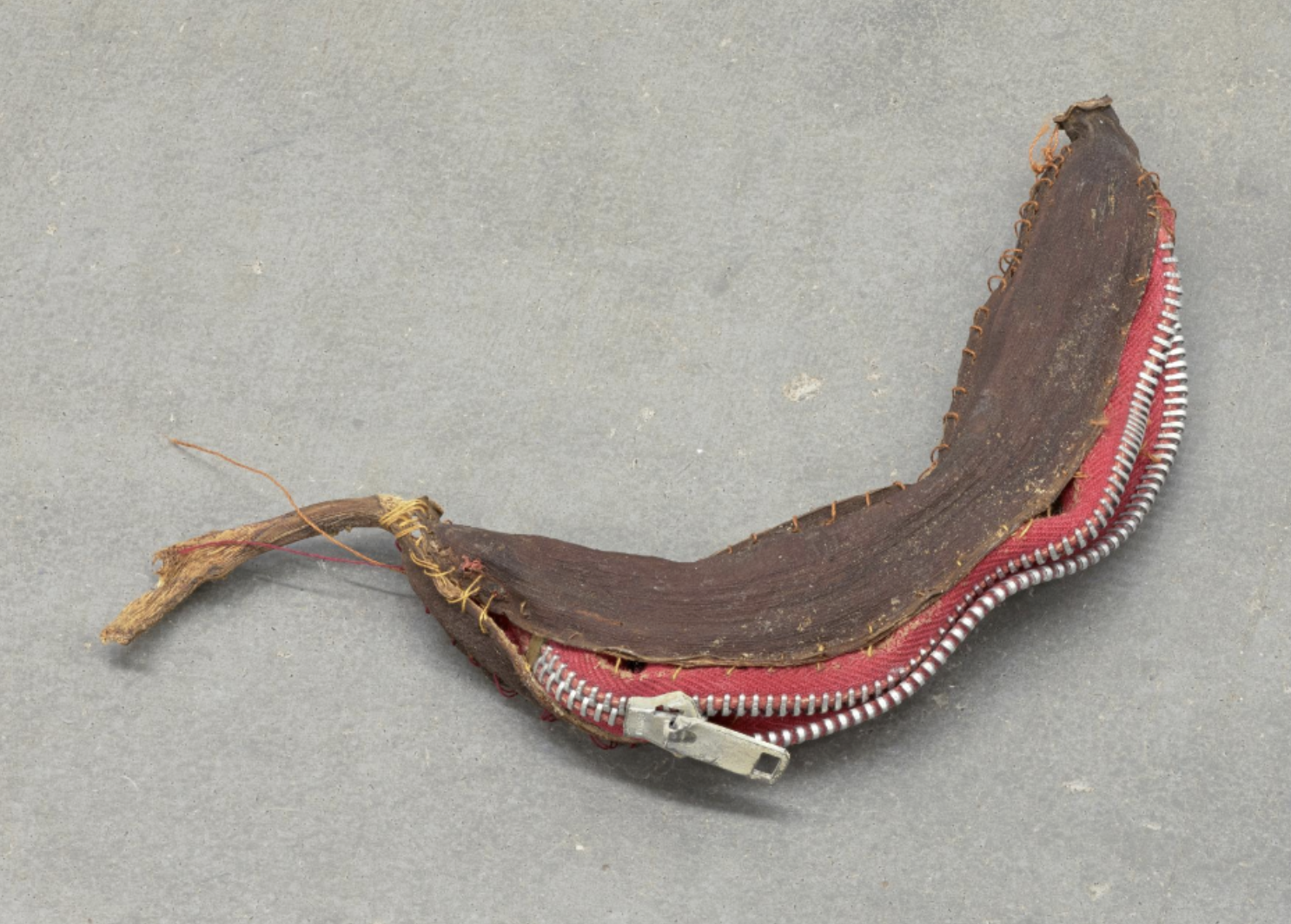 Past hallways of classic cornucopia still lifes is the exhibit “Strange Fruit,” made up of 300-odd citrus peels, banana skins, and avocado rinds. They’re all sutured back together with thread, buttons, Dole stickers, zippers.