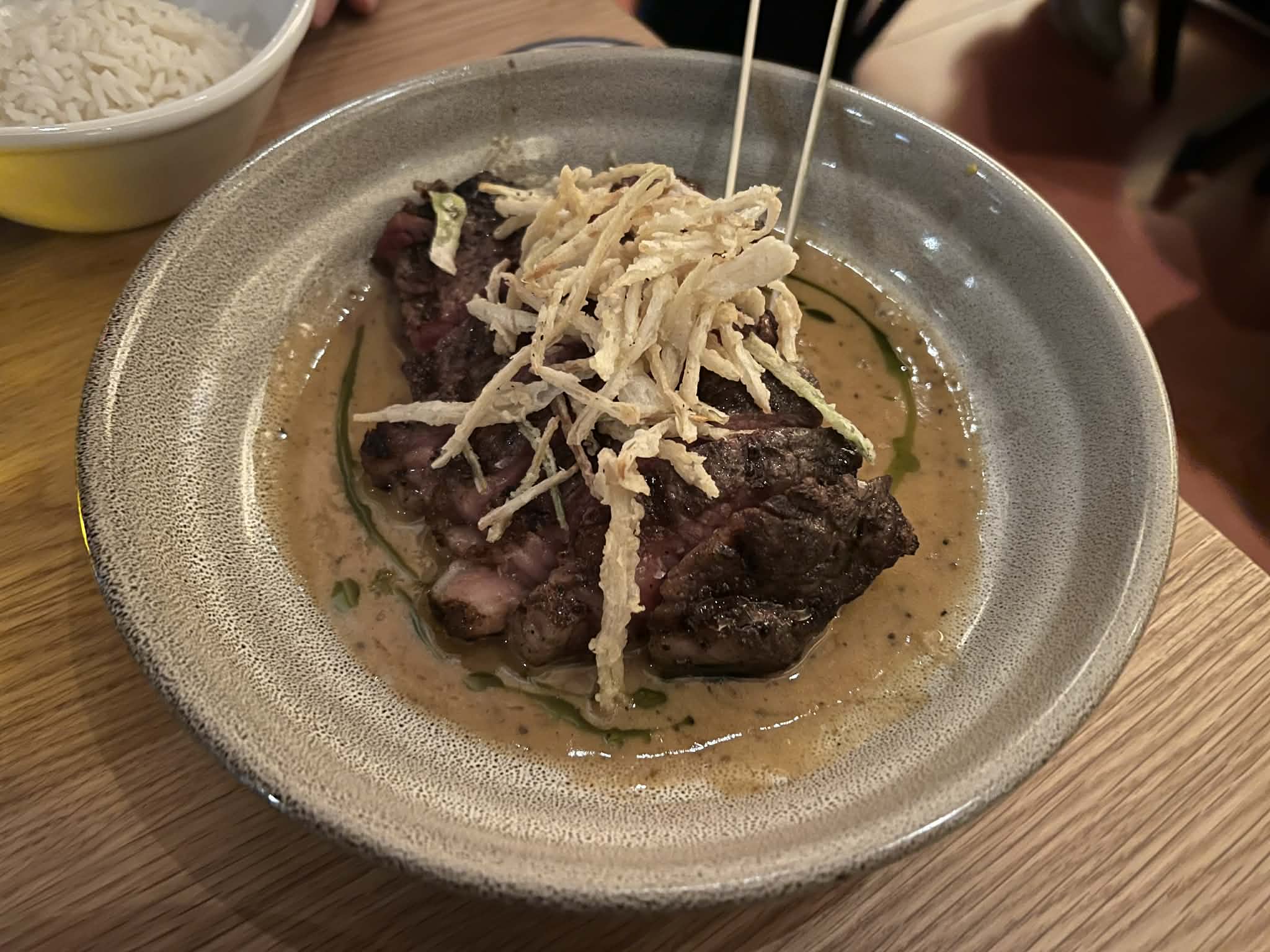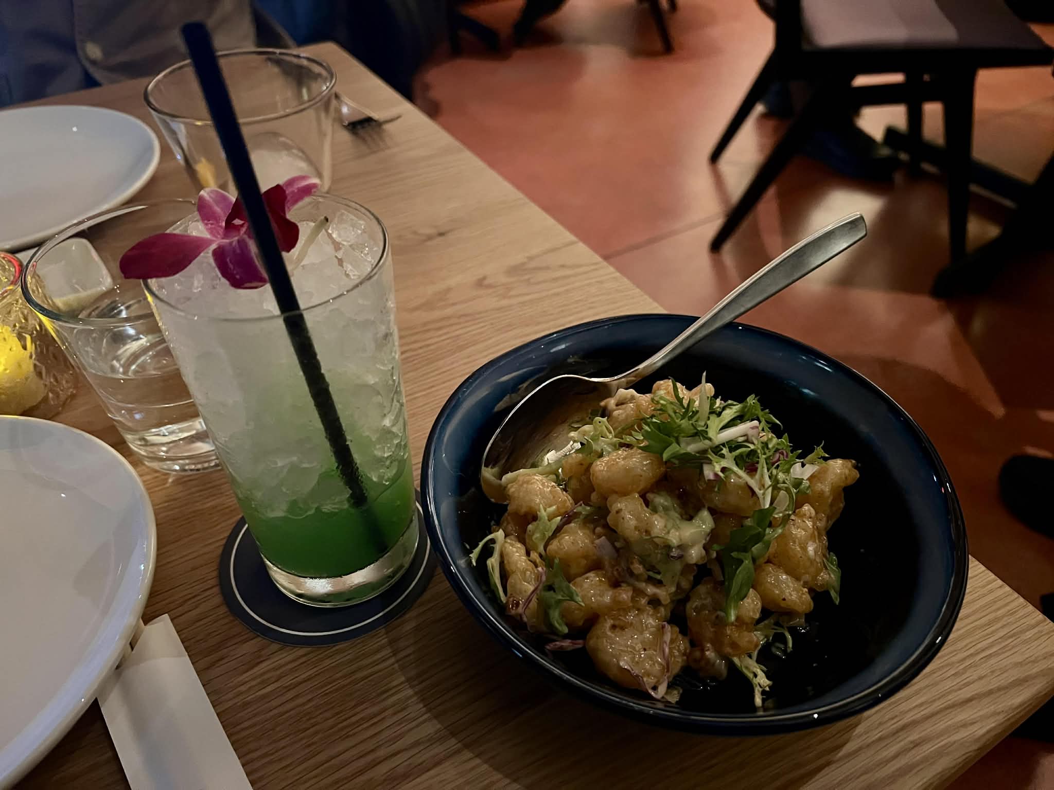 The menu is largely made up of small plates meant to be shared. I don’t eat fish, so that removed a significant amount of the sushi and whole fish dishes, though plenty of options remained. We opted for the tiger shrimp tempura, oxtail potstickers and the yuzu ribeye steak, which were more than enough to feed two people.