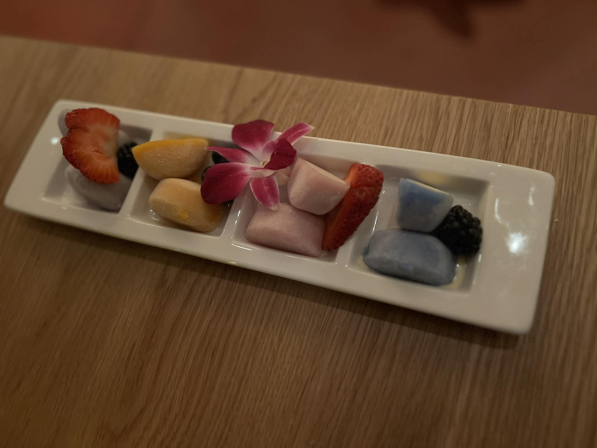 We ended with Japanese mochi ice cream– essentially balls of ice cream wrapped in a pounded dough made from steamed rice – which was another of my favorite dishes. That day’s flavors were strawberry, passionfruit, mango and cake batter, which were a light, sweet ending to our meal. The cake batter was my favorite and tasted like it was wrapped in raw sugar cookie dough – always a good thing. It was perhaps not a traditional Japanese flavor, but this American girl had no complaints.