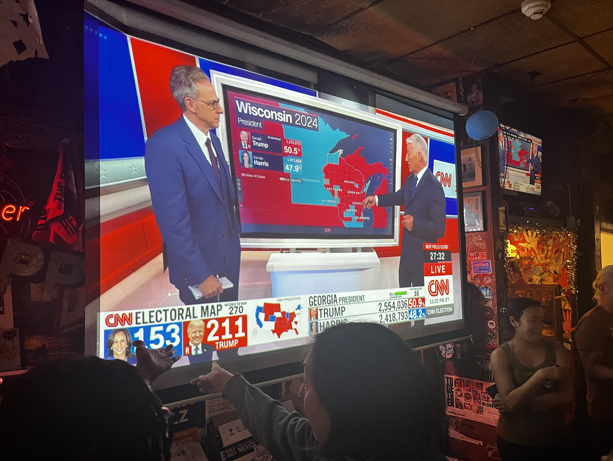 As CNN showed Trump casually sweeping the swing states, the Sanford & Son theme song pulled Boomers and Gen X-ers disappearing into their cups onto the dance floor. A green Conversed man wearing a “Bring on the Matriarchy” tee stopped looking at the screen and stepped into a lo-fi tap dance routine.