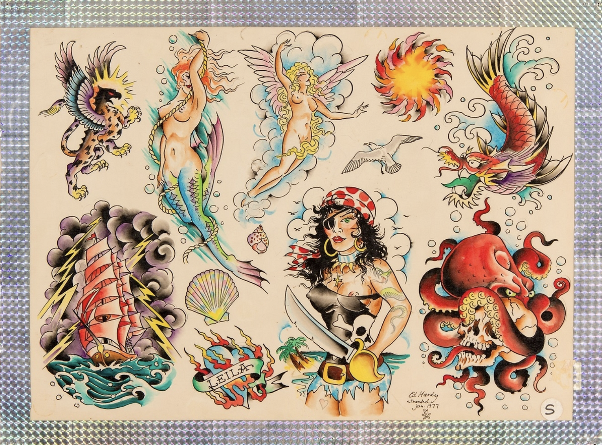 Of course, the artists on display are also talented tattoo artists as well. One wall of the exhibit was dedicated to tattoo concepts. One that stood out to me was the work of Ed Hardy, who’d gathered together a flash sheet of his nautically themed tattoos.His use of bright colors and the translucent nature of watercolors allows the bold inking of his images to come through, making his perky pirates and tall galleons pop off the paper.