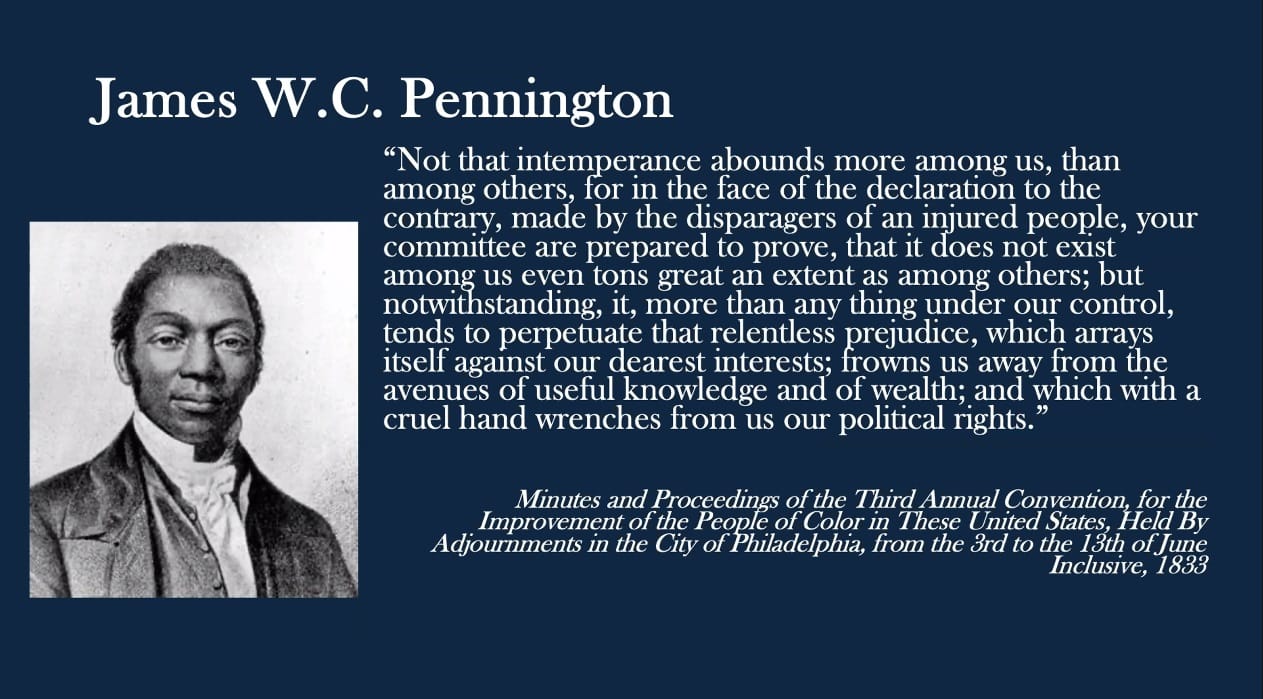 Still, that reality did not stop African American moral crusaders from linking a drive towards temperance with achieving freedom and dignity from white Americans. James W. C. Pennington, a formerly enslaved man who became a minister at Talcott Street Congregational Church in 1840, now known as the Faith Congregational Church, said that both alcoholism and slavery were a form of bondage, where one was physical and the other spiritual. He said that drunkenness diminished African Americans' chance for freedom, even while acknowledging that African Americans were no more given to drunkenness than any other group of people: