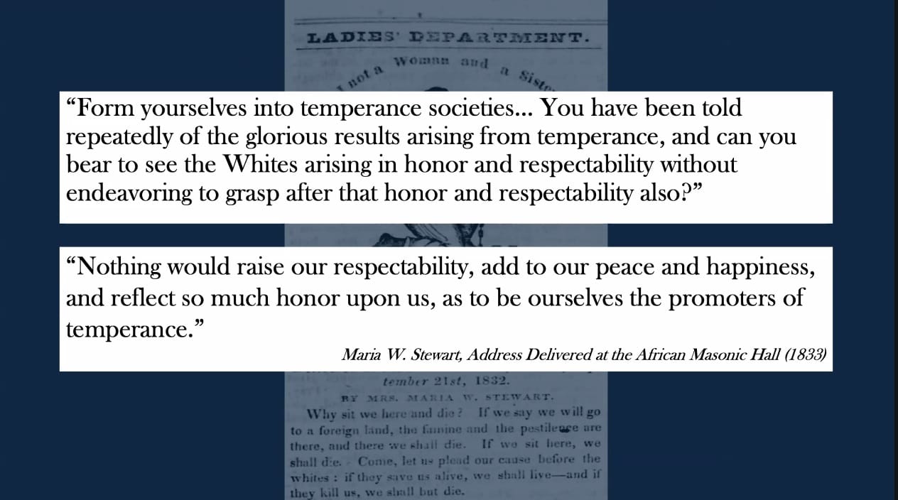 Maria W. Stewart, who was born in Hartford and moved to Boston, was even more pointed in her correlation of temperance and freedom. Stewart was excluded from many African American temperance organizations because she was a woman, which highlights the often rank hypocrisy of public moralizers (staring SQUARELY at Cosby). She stated that temperance was necessary for liberation, literally using the word “respectability” in her exhortations: