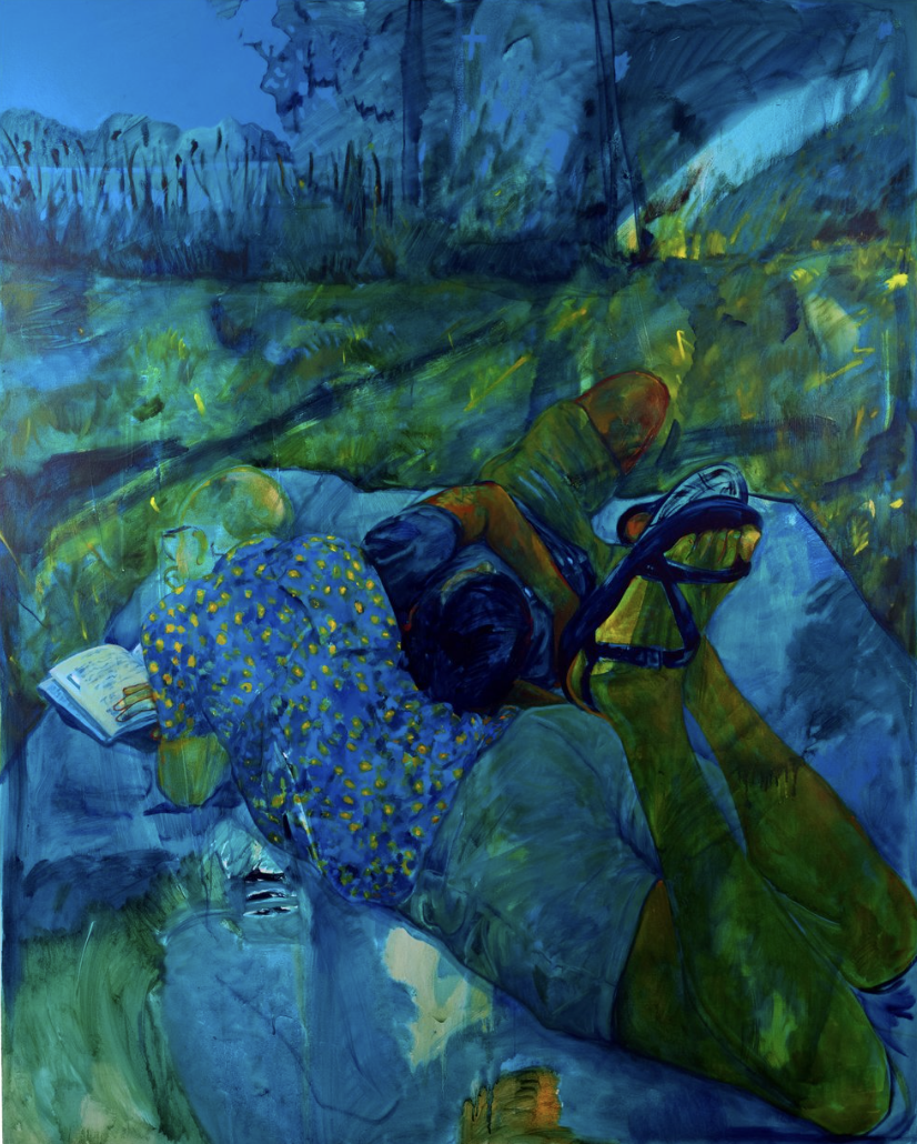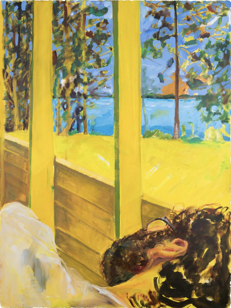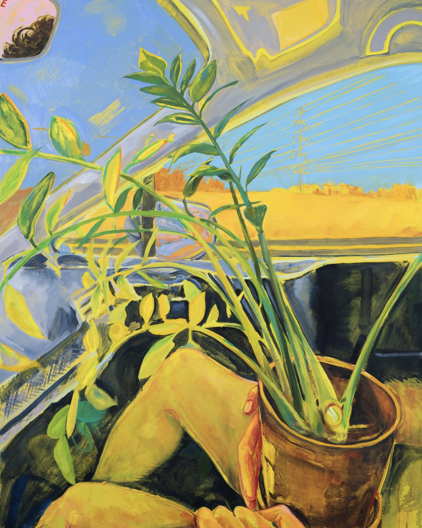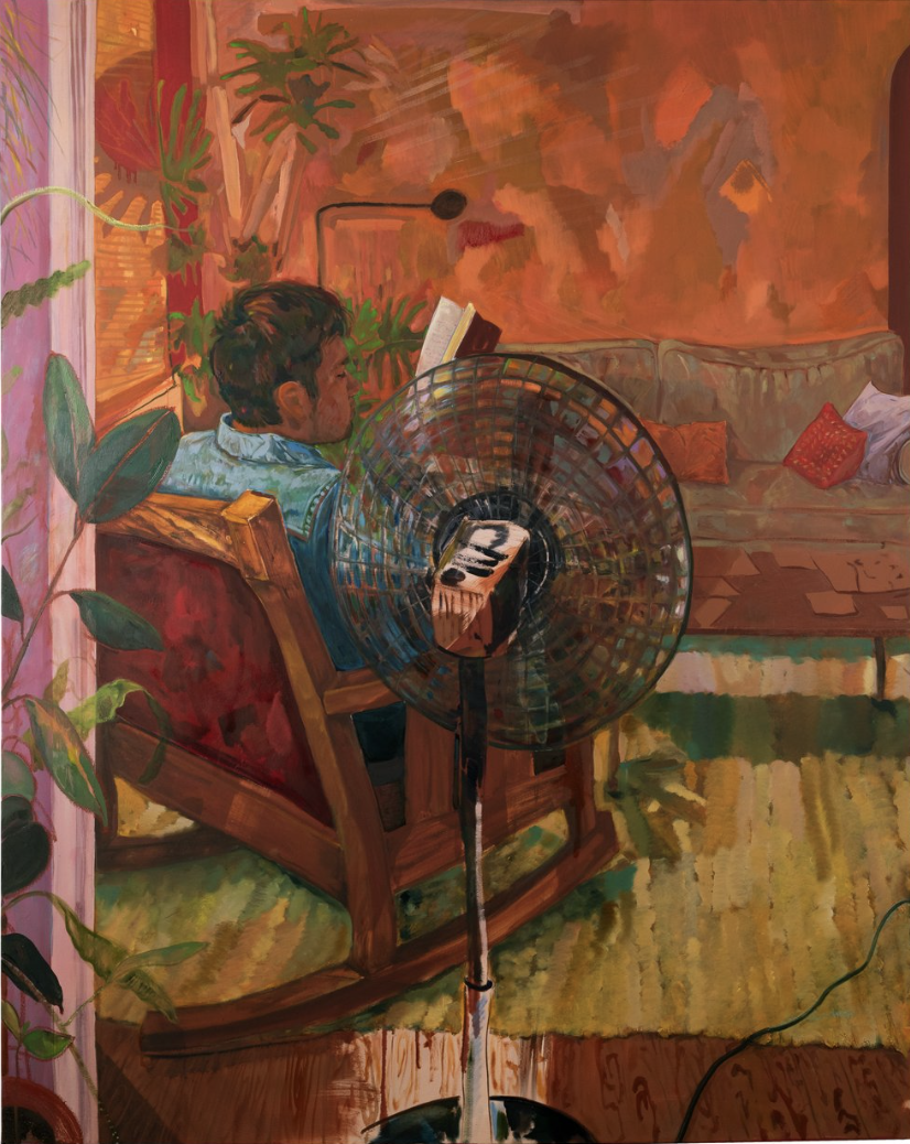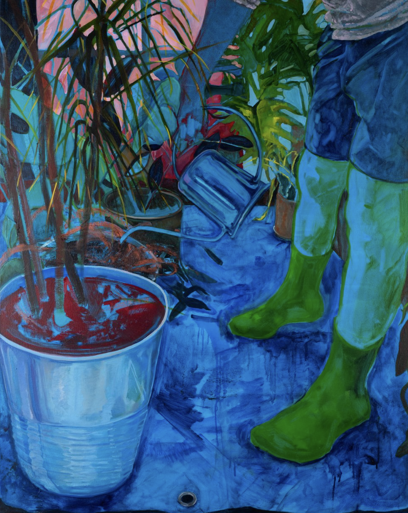 The art is clearly a product of the times: Polka dot tee-shirts, Tevas, and cuffed jeans resurrect a hipster sensibility, one that harkens back to the subculture’s sense of soft core outsider-dom. But the most important element of this aesthetic is the pacifist devotion to plant life. Indoors, Wehrwein's subjects are shrouded in floral sheets or surrounded by hanging plants and potted palms; in other paintings, people look out at gardens, towering evergreens, or ponds fenced by cattails.