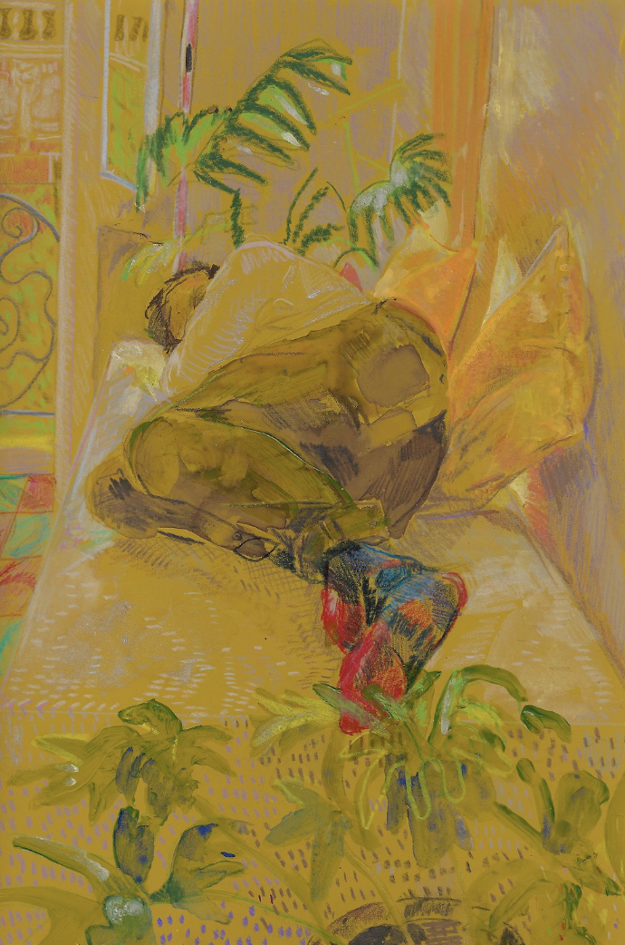 Each image in the show captures a human subject caught up in their own inner reality. The artist’s eye represents the intimacy of witnessing someone wrapped in reflection without posing disruption as an onlooker. The works read as odes to ordinary moments: napping; journaling; sitting at the kitchen table; reading; watering plants.