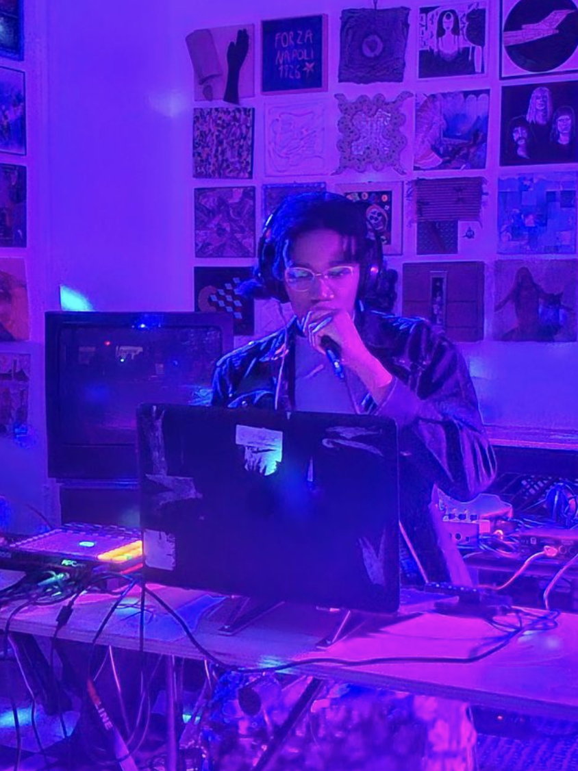 The last performance of the night was Asphalt Savannahs. The sound was complex, genre jumping and built on many beats. The performance cut like butter through a vast array of influences. At times, they sounded like OG house, glitch, screwed, ambient soundtrack, and even plundertronics or old school vaporwave à la Chuck Persons. Beats were spliced straight on top of rhythmic phrases, constantly moving them forward and contrasting them. They could easily do an experimental soundscape, but also just as easily perform at a dance night and get a crowd moving. Asphalt Savannahs themself had a gifted voice. In addition to their own original melodies, they sang samples from other songs, organically looping their voice into the mechanistic creativity of their performance. As they sang, the colors of the room changed dramatically towards a bright purple, pink and blue spectrum, dots and crescent moon shapes littering the walls and ending this special evening on celestial upswing. Attendees seemed energized, having eagerly followed the winding path the show had taken. Everyone stuck around lingering and talking before falling back into the cold march towards their homes.