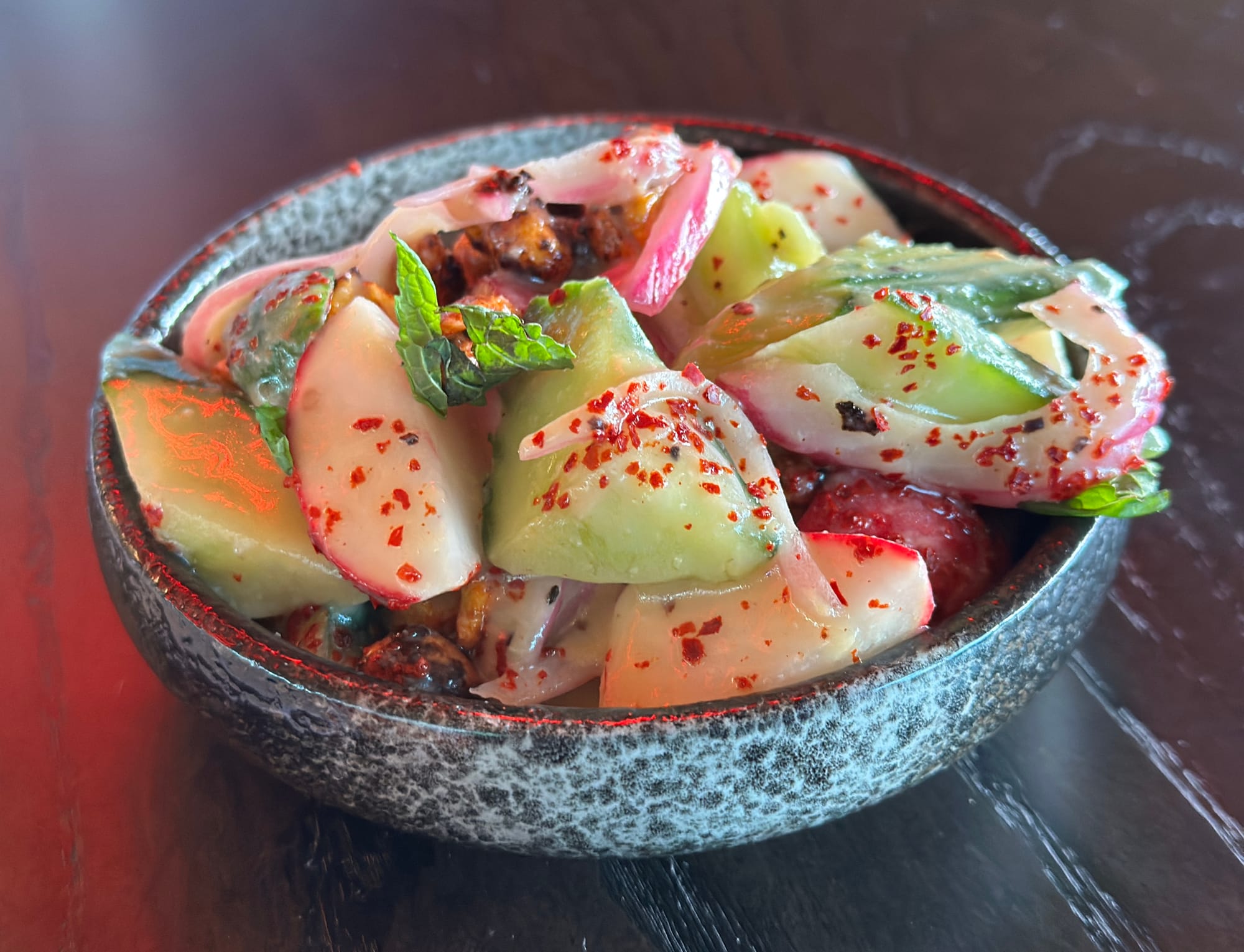 Among the appetizers, the Cucumber Salad ($8) is a new summertime must-have. It’s a small bowl that punches above its weight: Cool cukes, crushed peanuts, and pickled onion in a miso-spiked vinaigrette that’s funky, tart, and electric with well-timed heat, while peanuts and radish bring crunch and earthiness. It recalls Korean banchan in spirit but with its own identity.